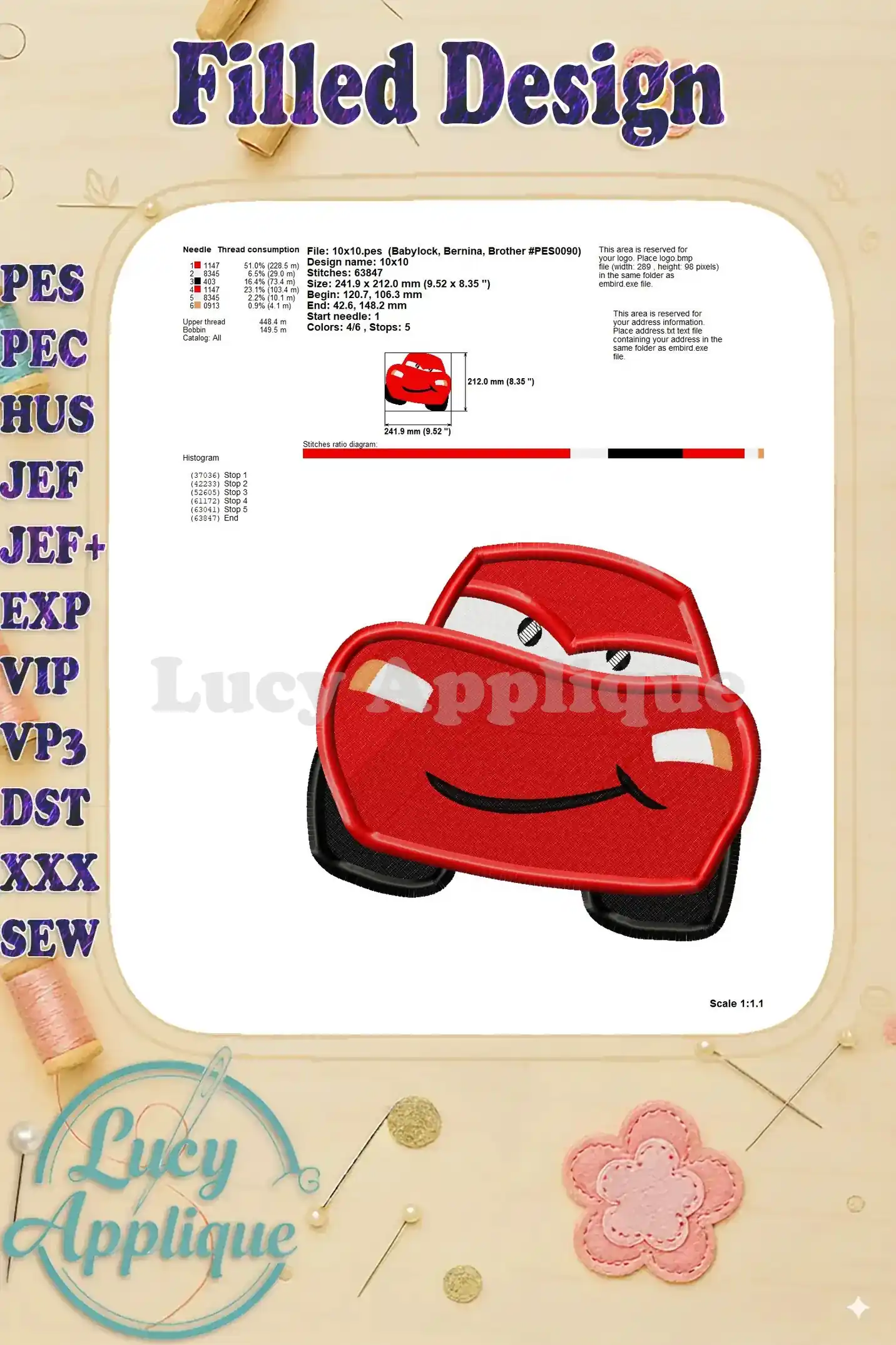 Lightning McQueen Cars Fill Machine 02 Embroidery Design – Instant Download