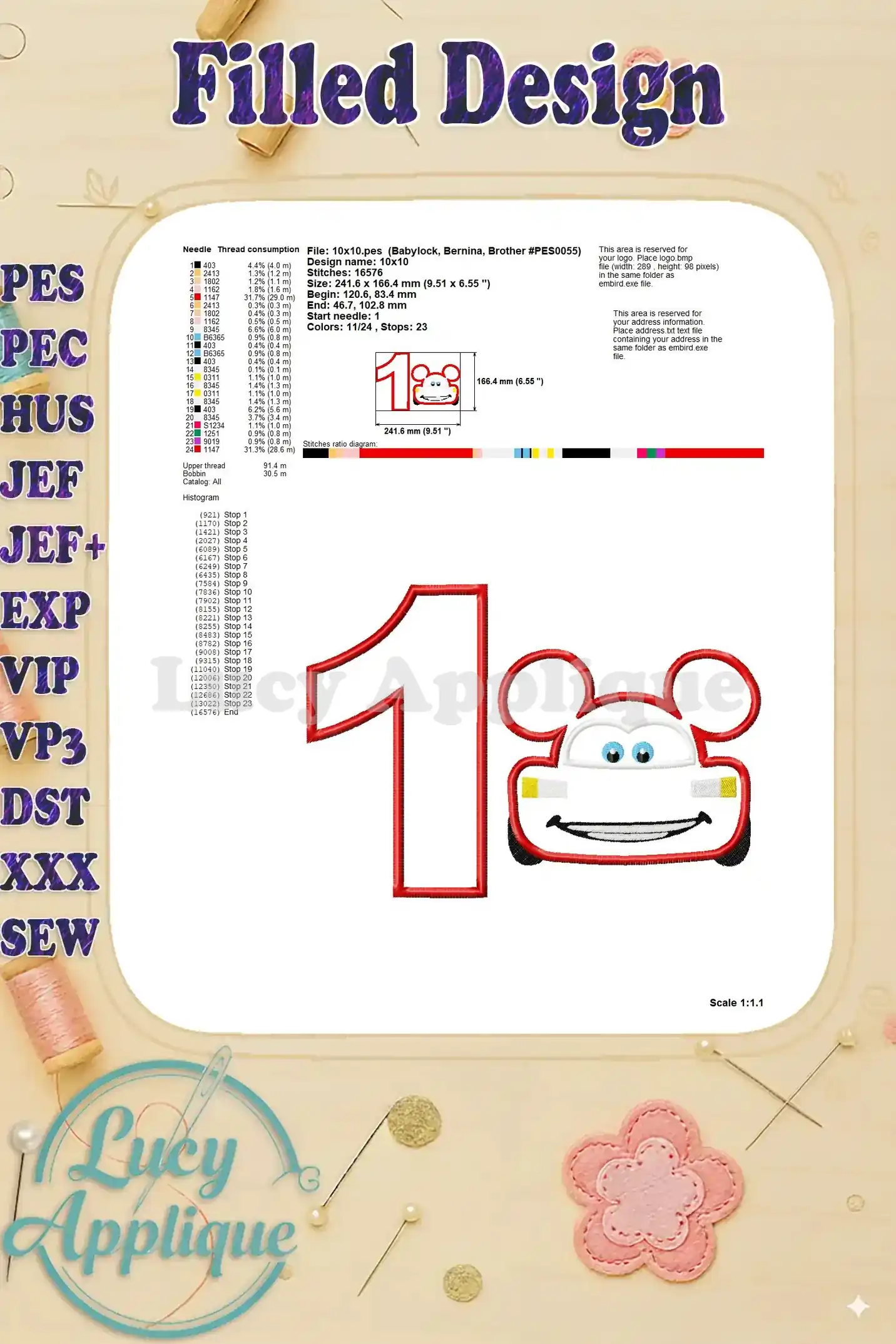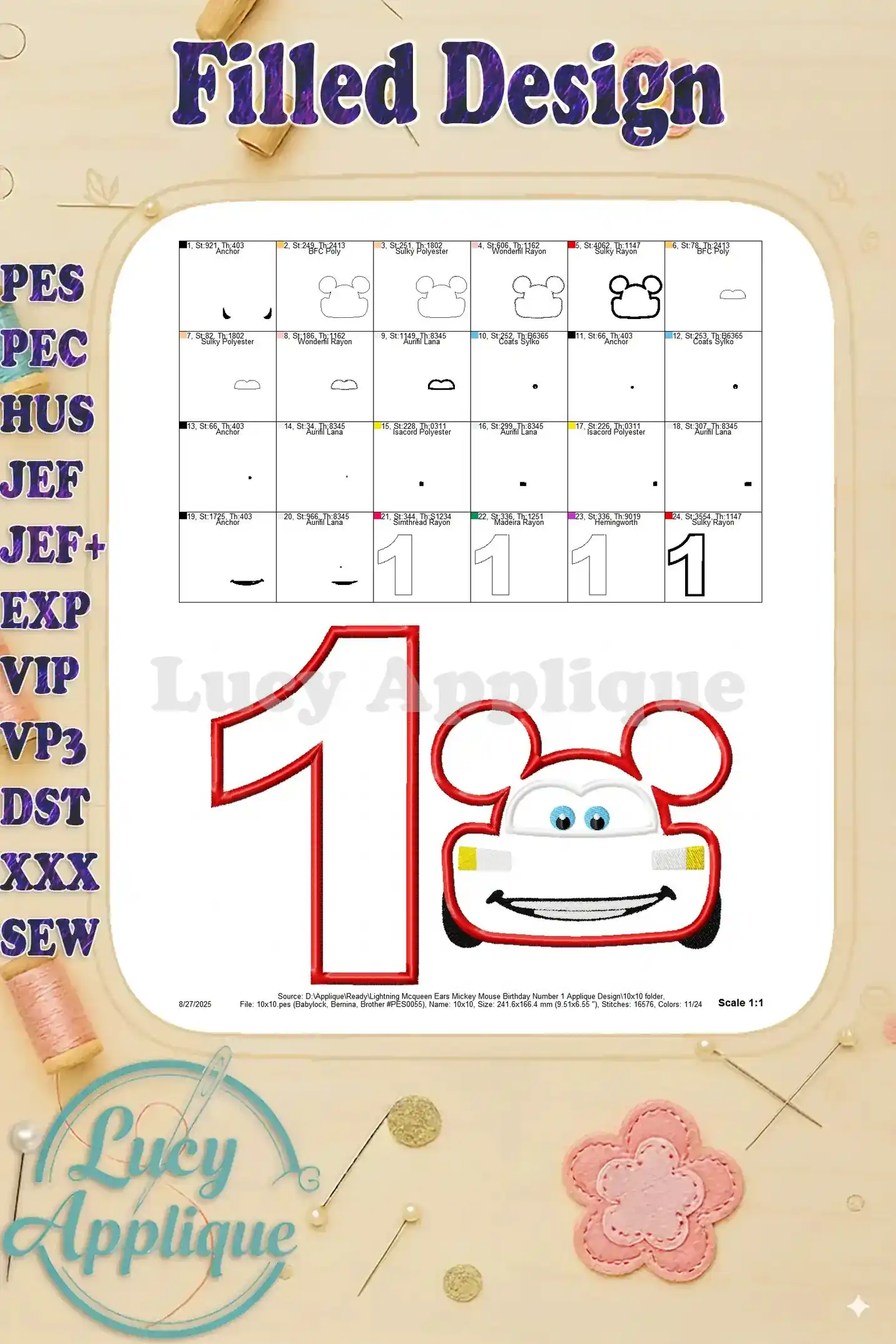 Lightning Mcqueen Ears Mickey Mouse Birthday Number 1 Applique Design – Instant Download