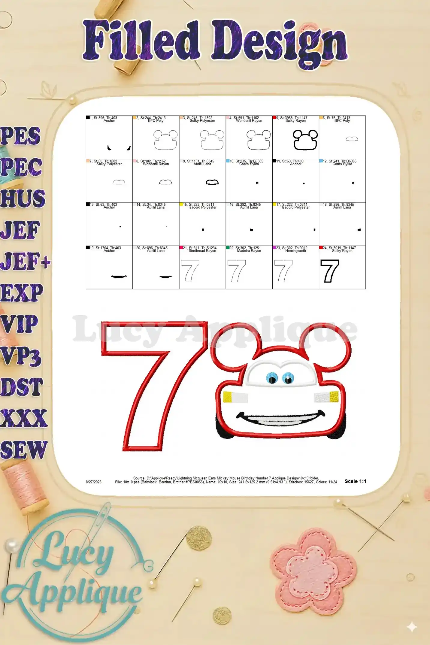 Lightning Mcqueen Ears Mickey Mouse Birthday Number 7 Applique Design – Instant Download