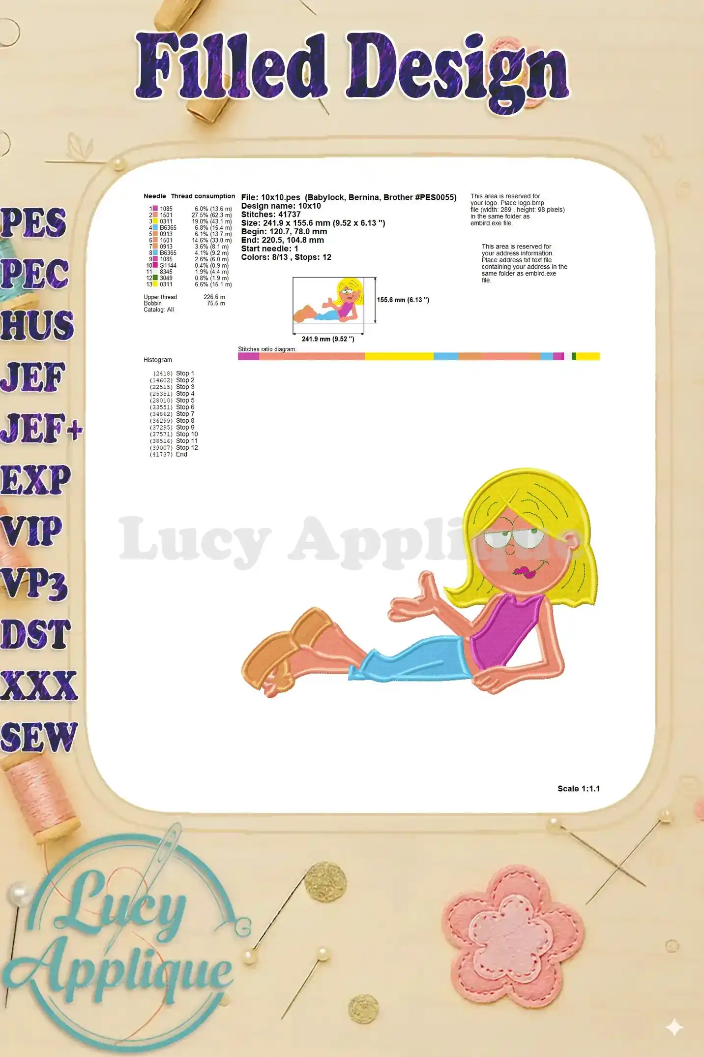 Adorable Lizzie McGuire filled embroidery design! Perfect for fans of the show. High-quality design, easy to stitch. Get yours today!