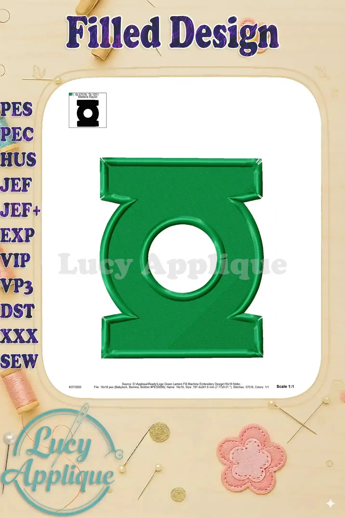Logo Green Lantern Fill Machine Embroidery Design – Instant Download