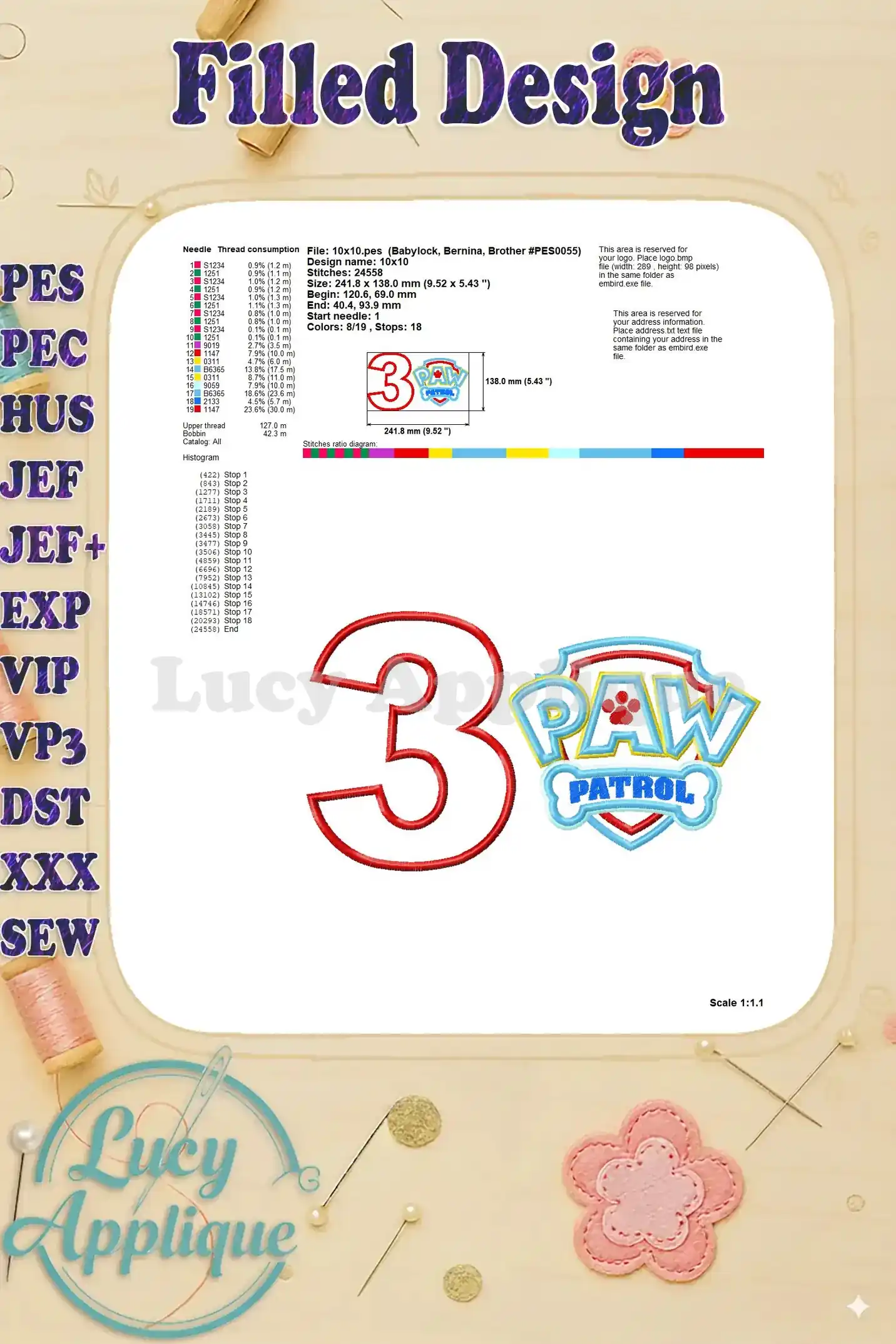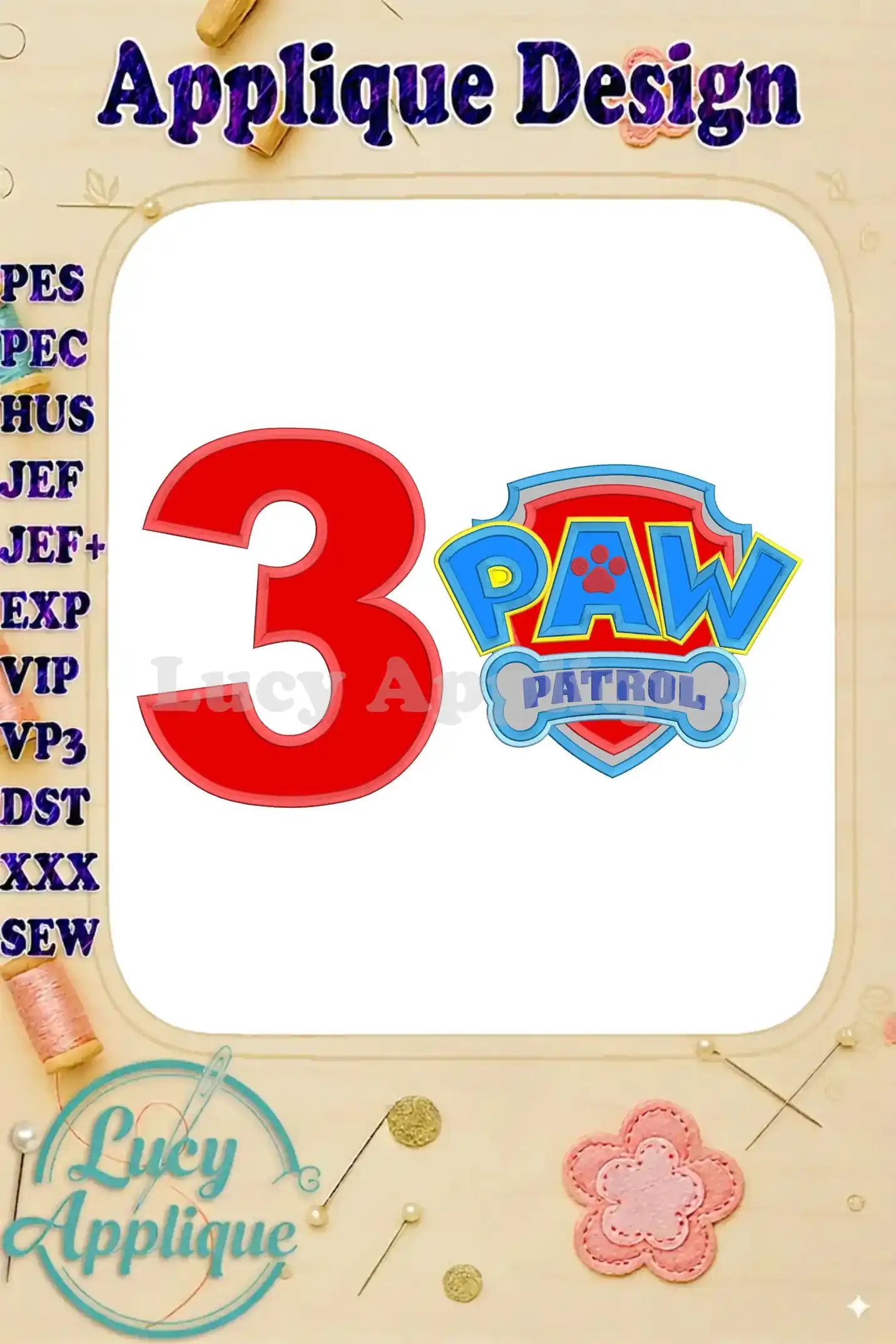 Logo Paw Patrol Birthday Number 3 Applique 04 Design – Instant Download