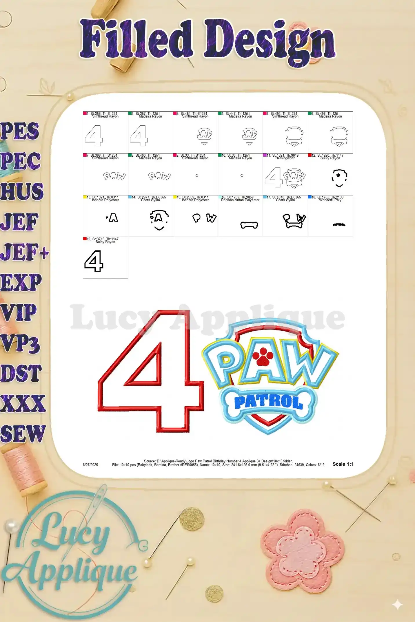 Logo Paw Patrol Birthday Number 4 Applique 04 Design – Instant Download