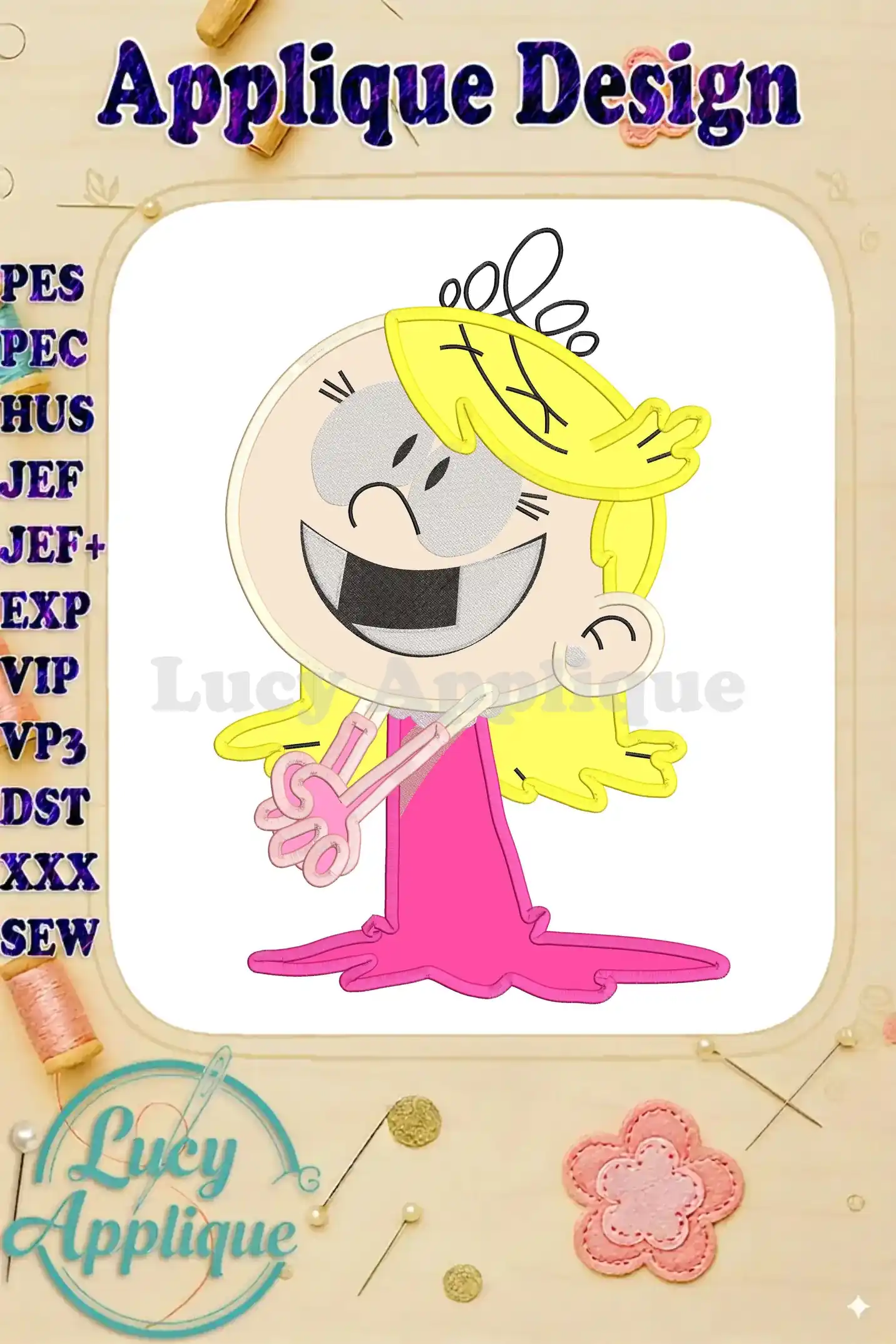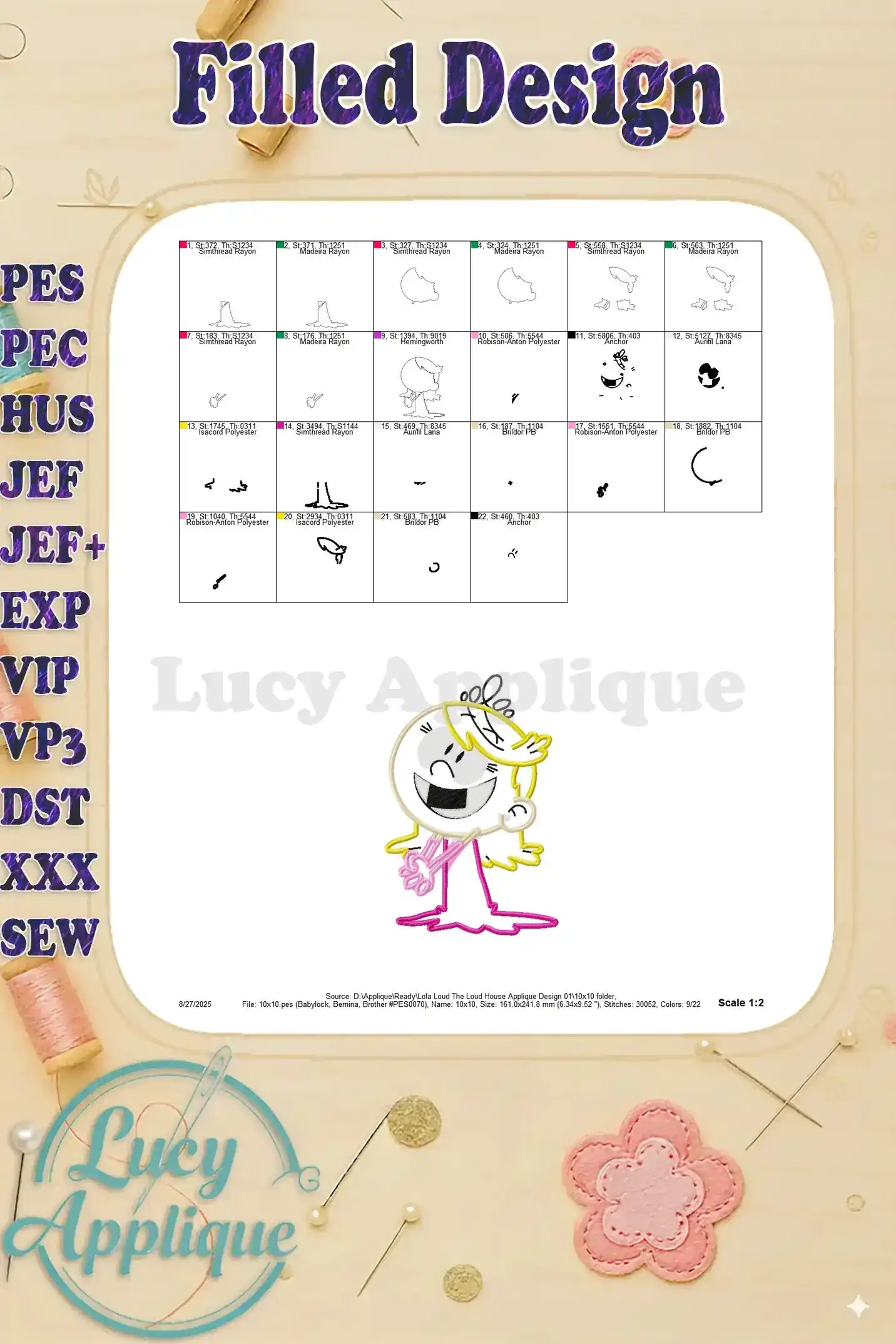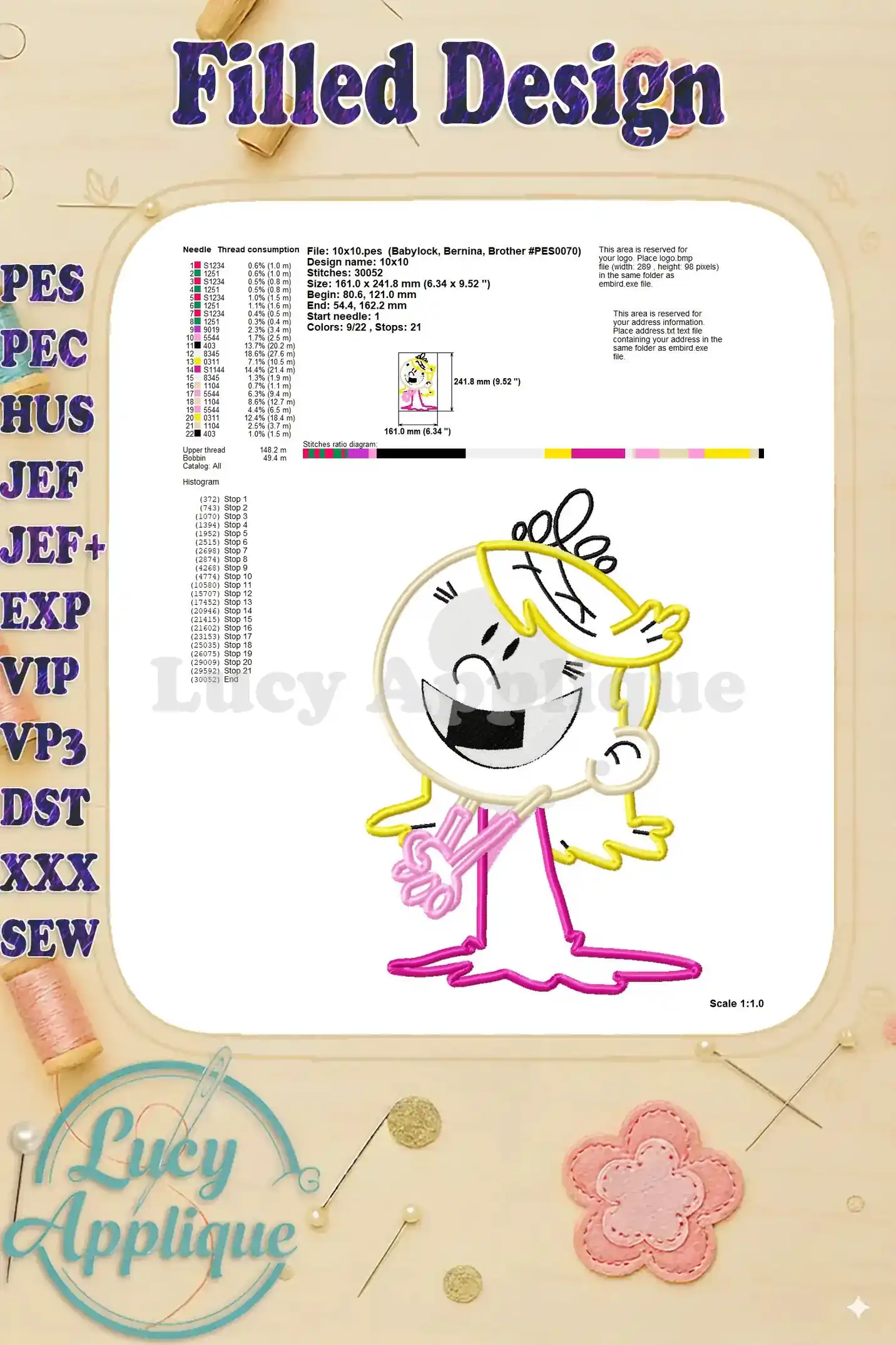 Adorable Lola Loud applique embroidery design! Perfect for fans of The Loud House. Includes detailed color charts and multiple file formats for various machines. Easy to follow instructions for a flawless finish.