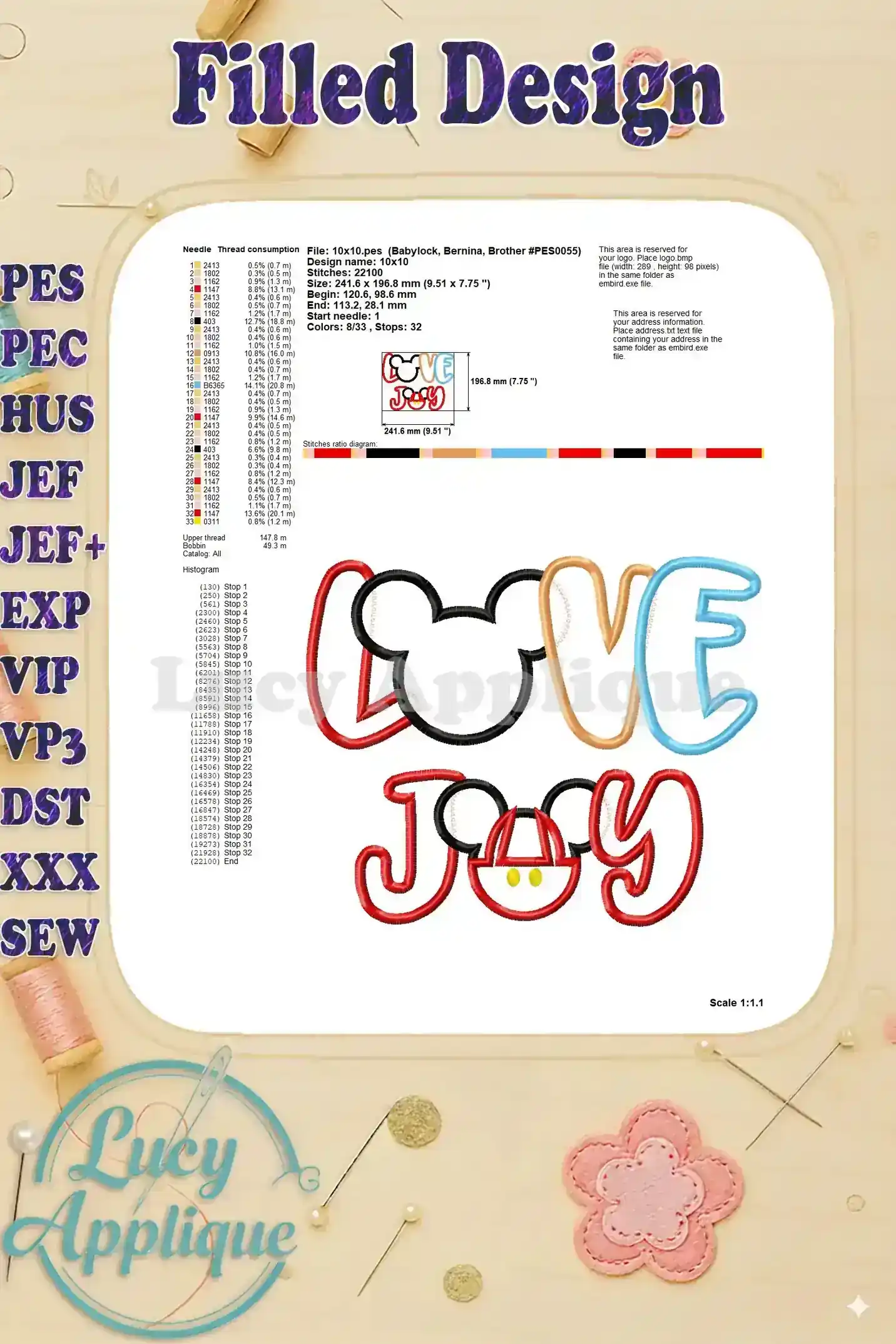 Love Joy Mickey Mouse Applique Design – Instant Download