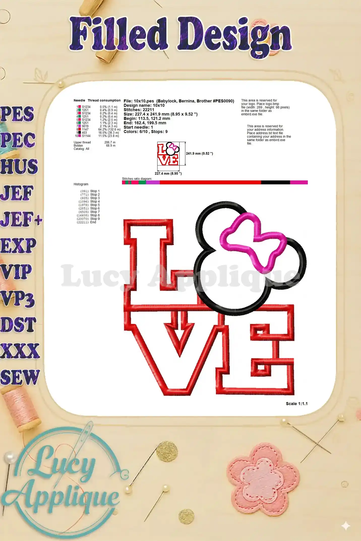 Love Minnie Mouse Applique Embroidery Design – Instant Download