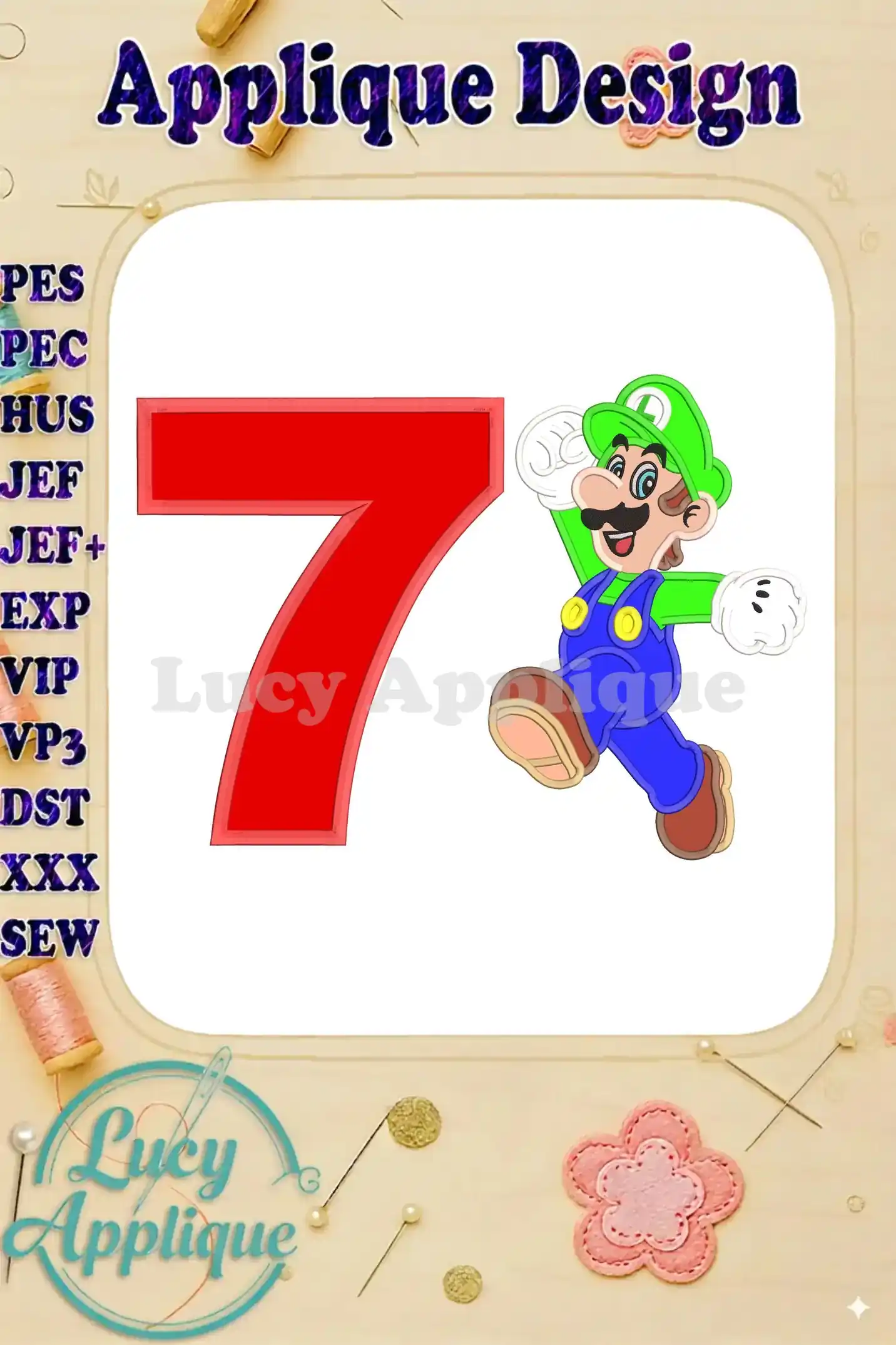 Luigi Super Mario Birthday Number 7 Applique 03 Design – Instant Download