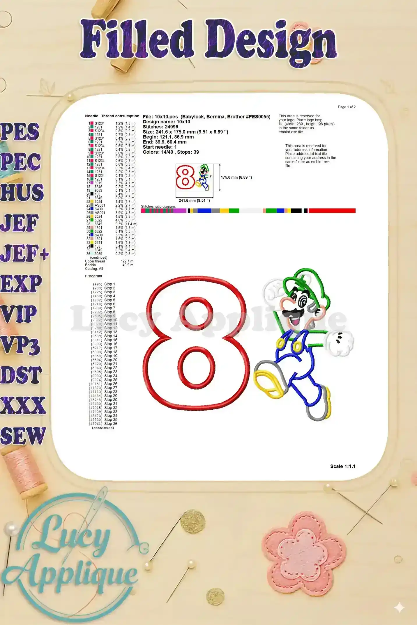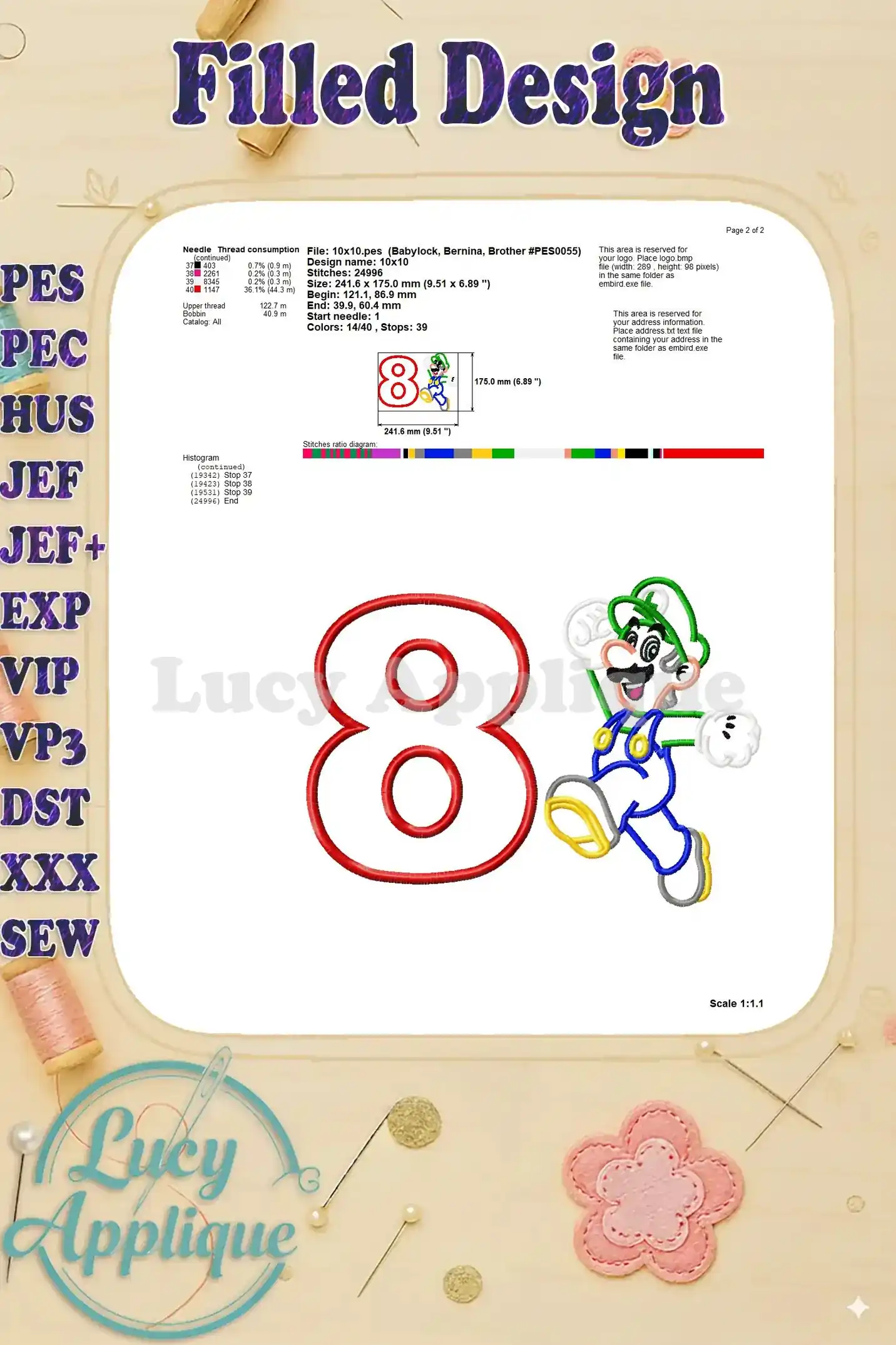Luigi Super Mario Birthday Number 8 Applique 03 Design – Instant Download