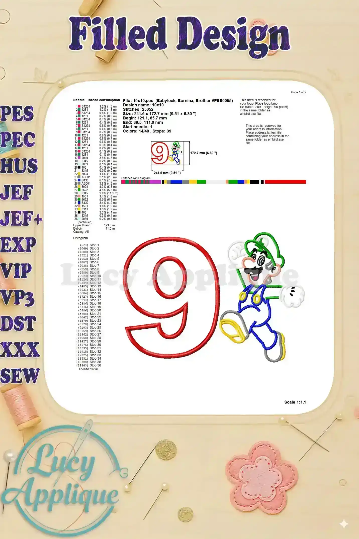 Luigi Super Mario Birthday Number 9 Applique 03 Design – Instant Download