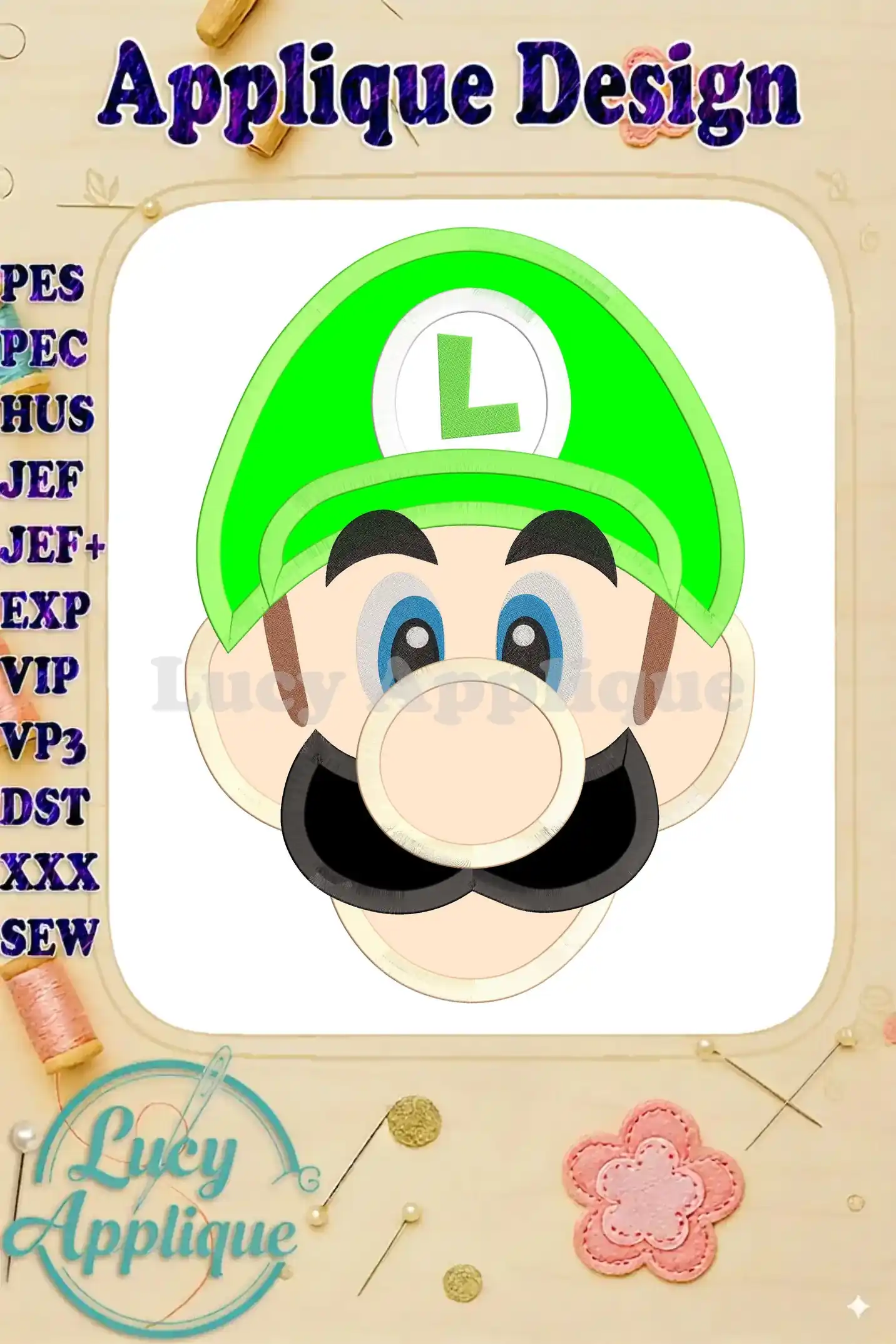 Luigi Super Mario Head Applique Embroidery Design – Instant Download