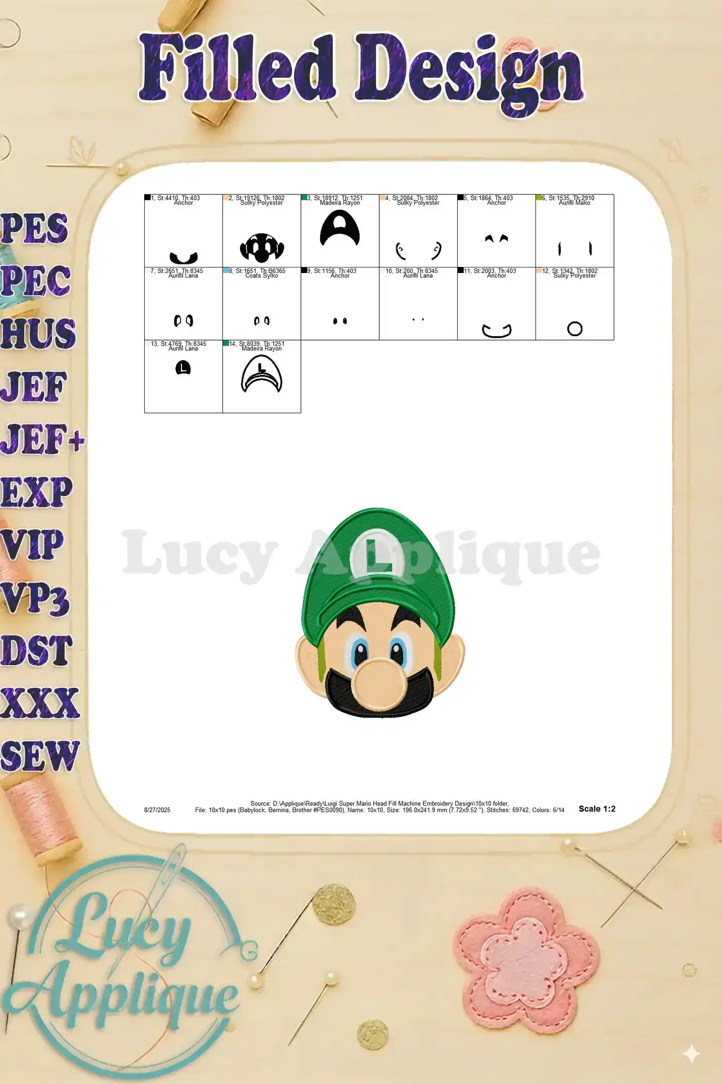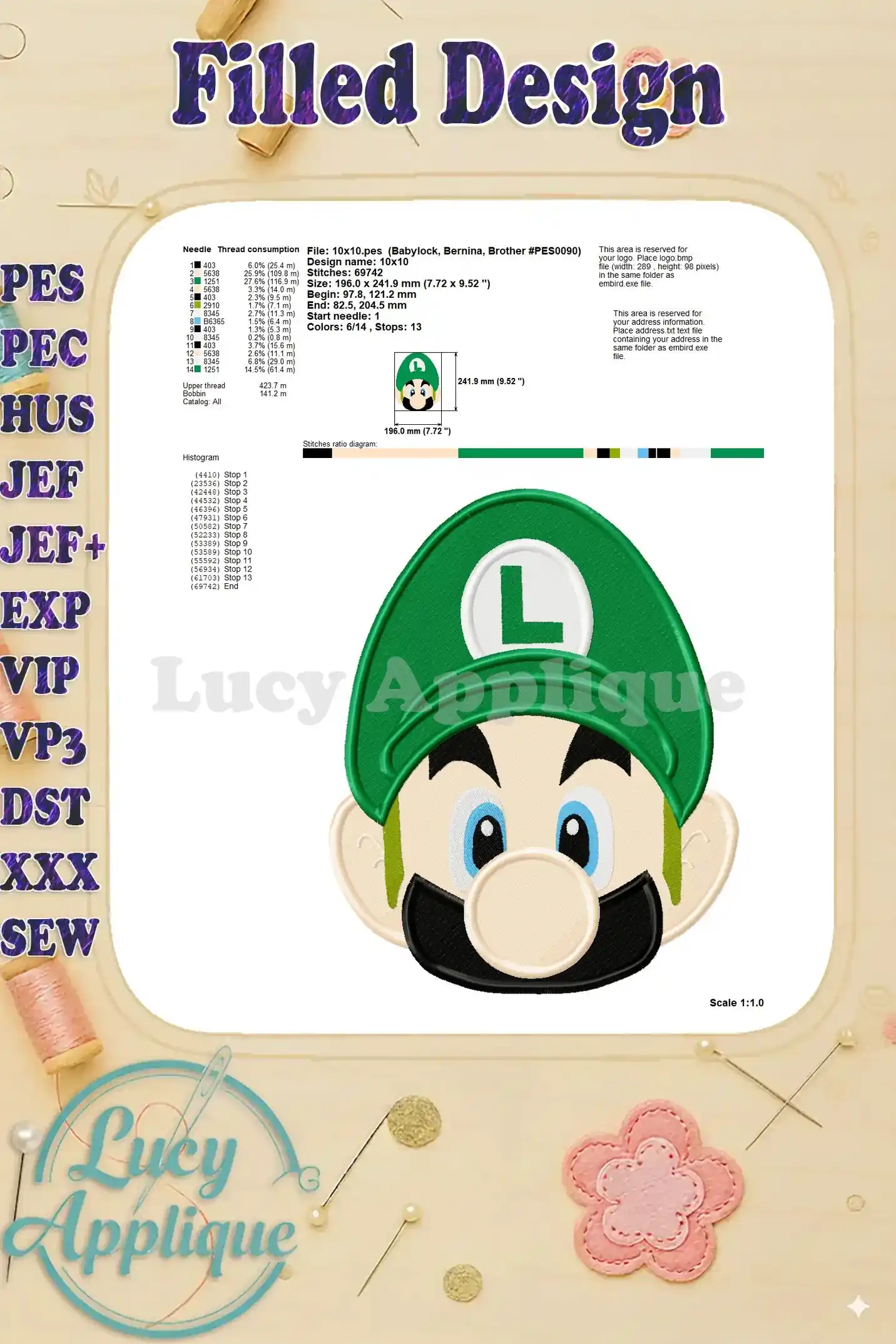 Luigi Super Mario Head Fill Machine Embroidery Design – Instant Download