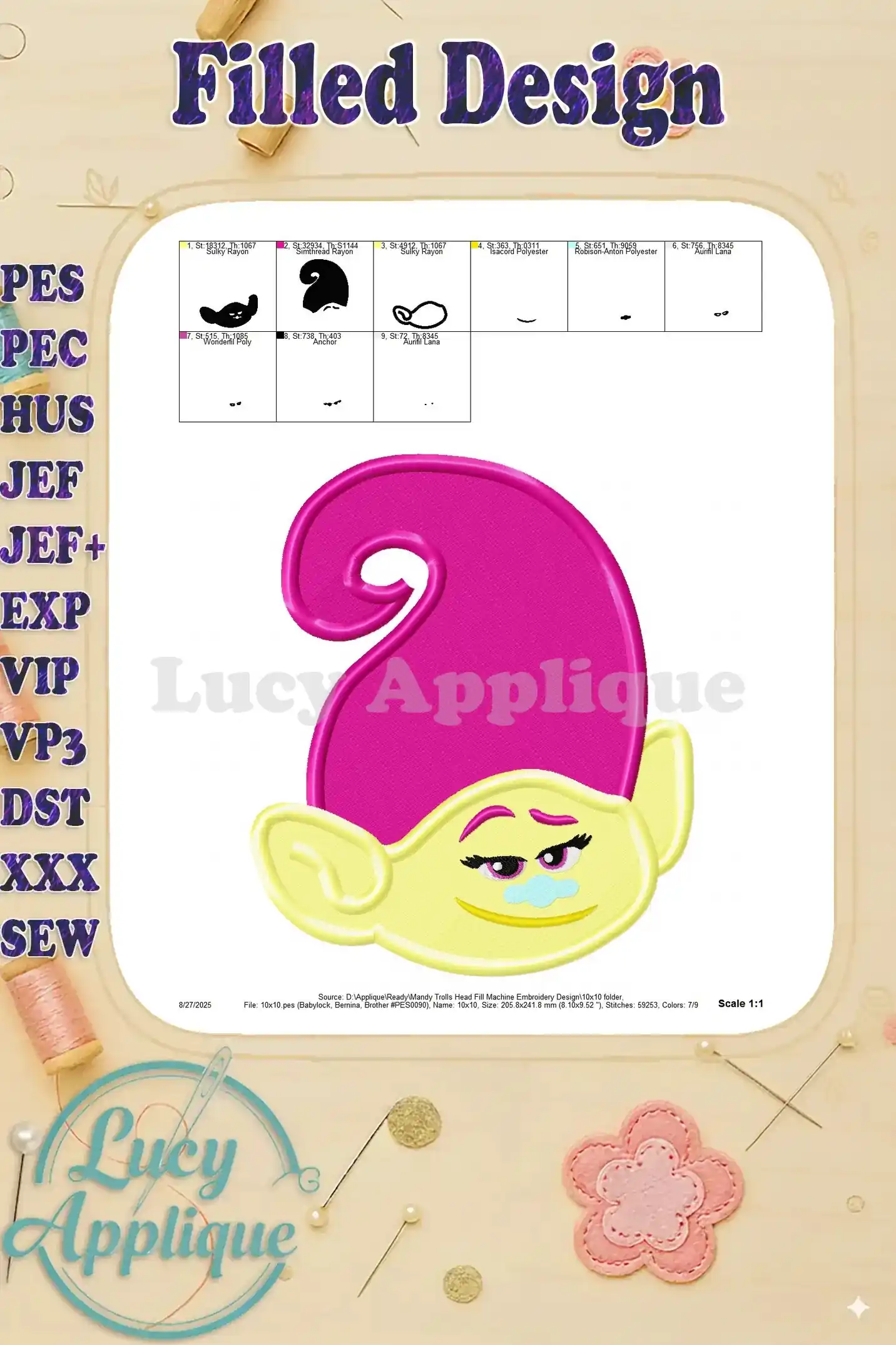 Mandy Trolls Head Fill Machine Embroidery Design – Instant Download