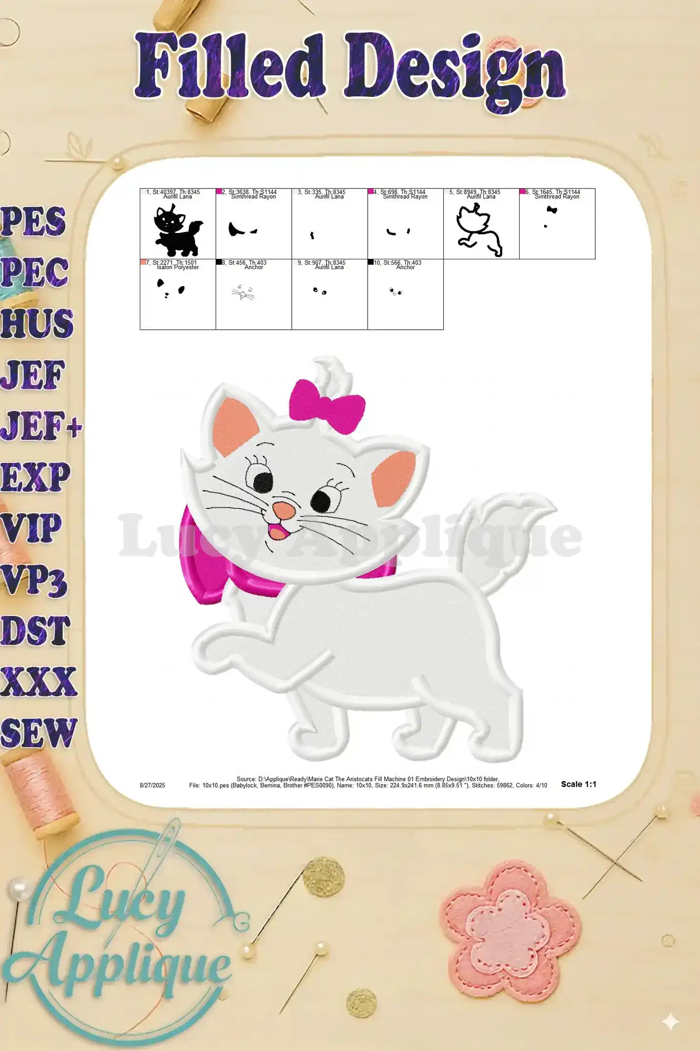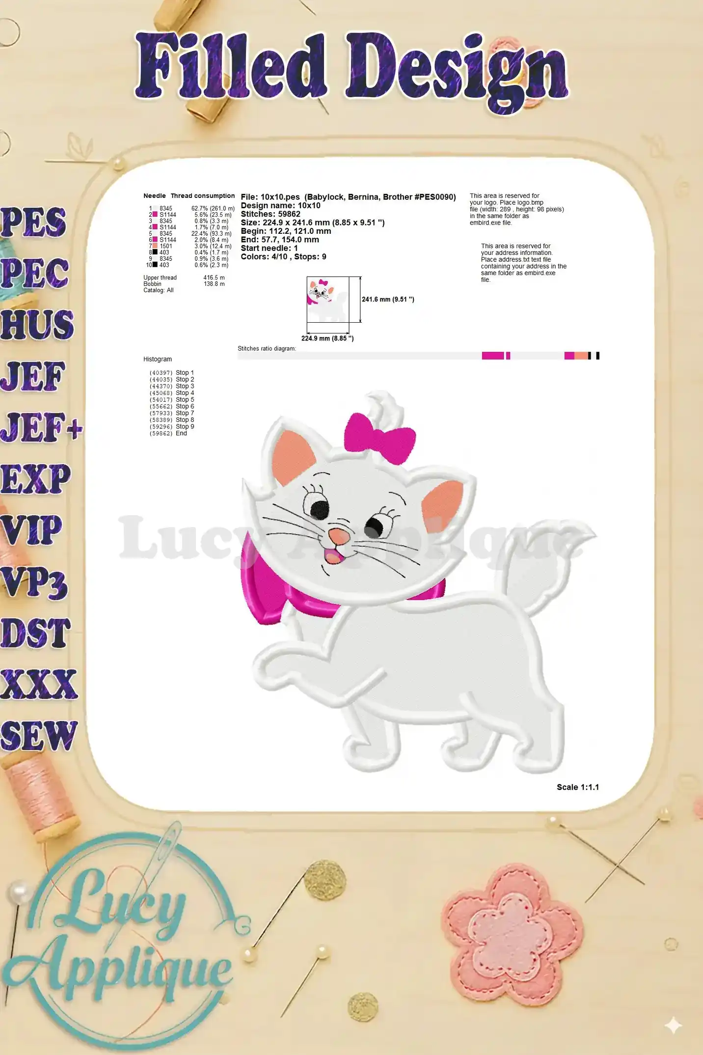 Marie Cat The Aristocats Fill Machine 01 Embroidery Design – Instant Download