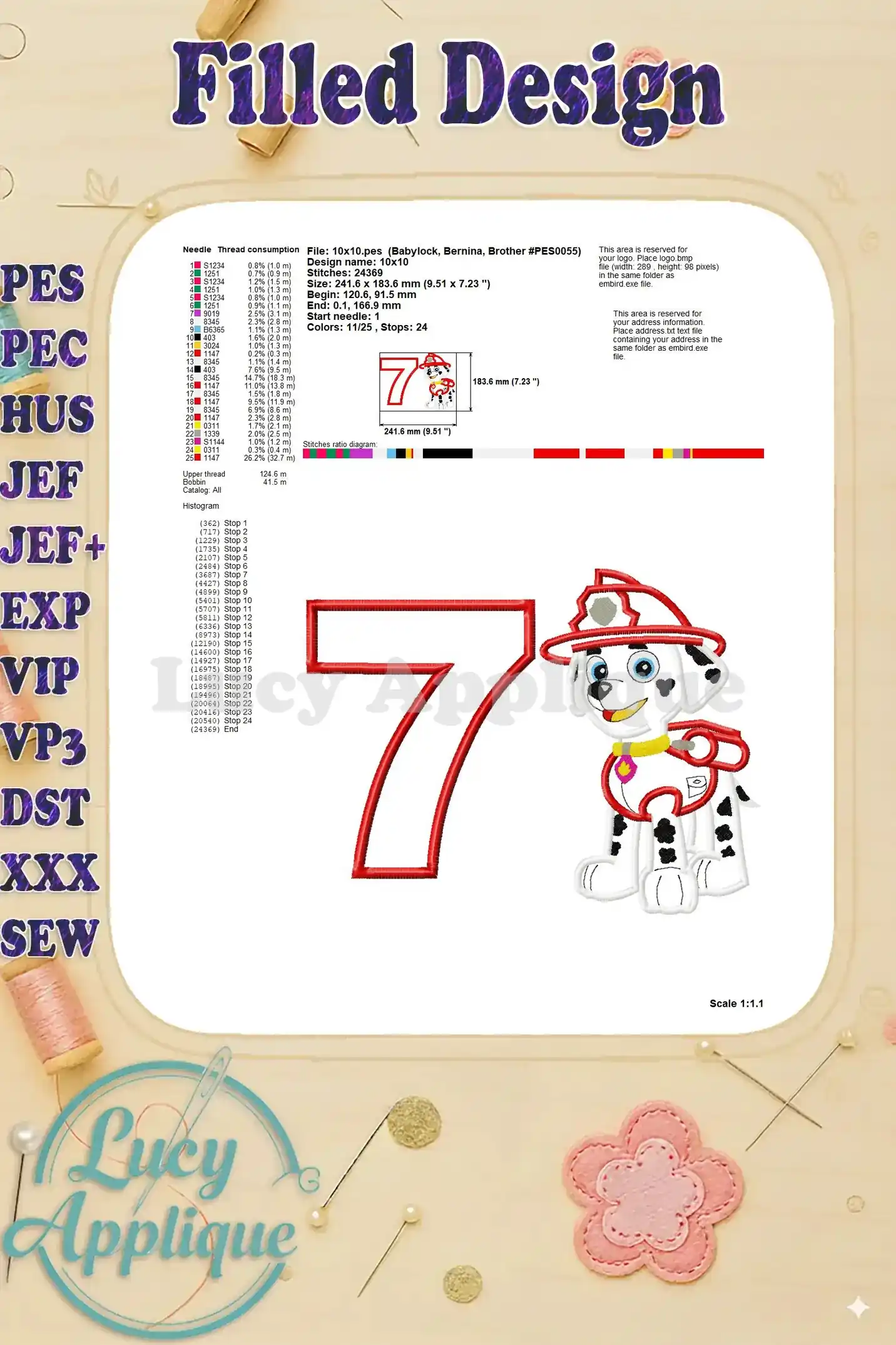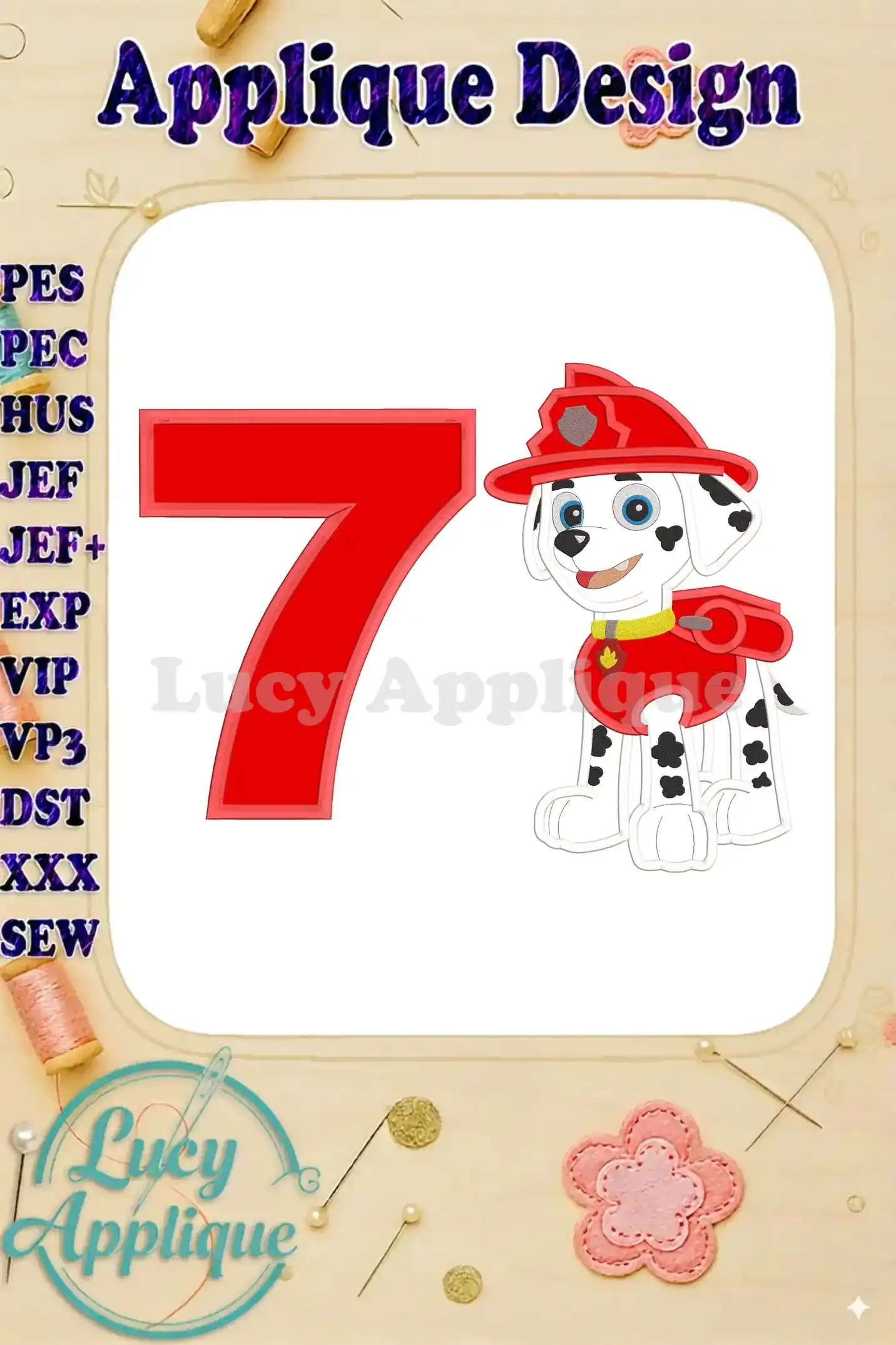 Marshall Paw Patrol Birthday Number 7 Applique Design – Instant Download