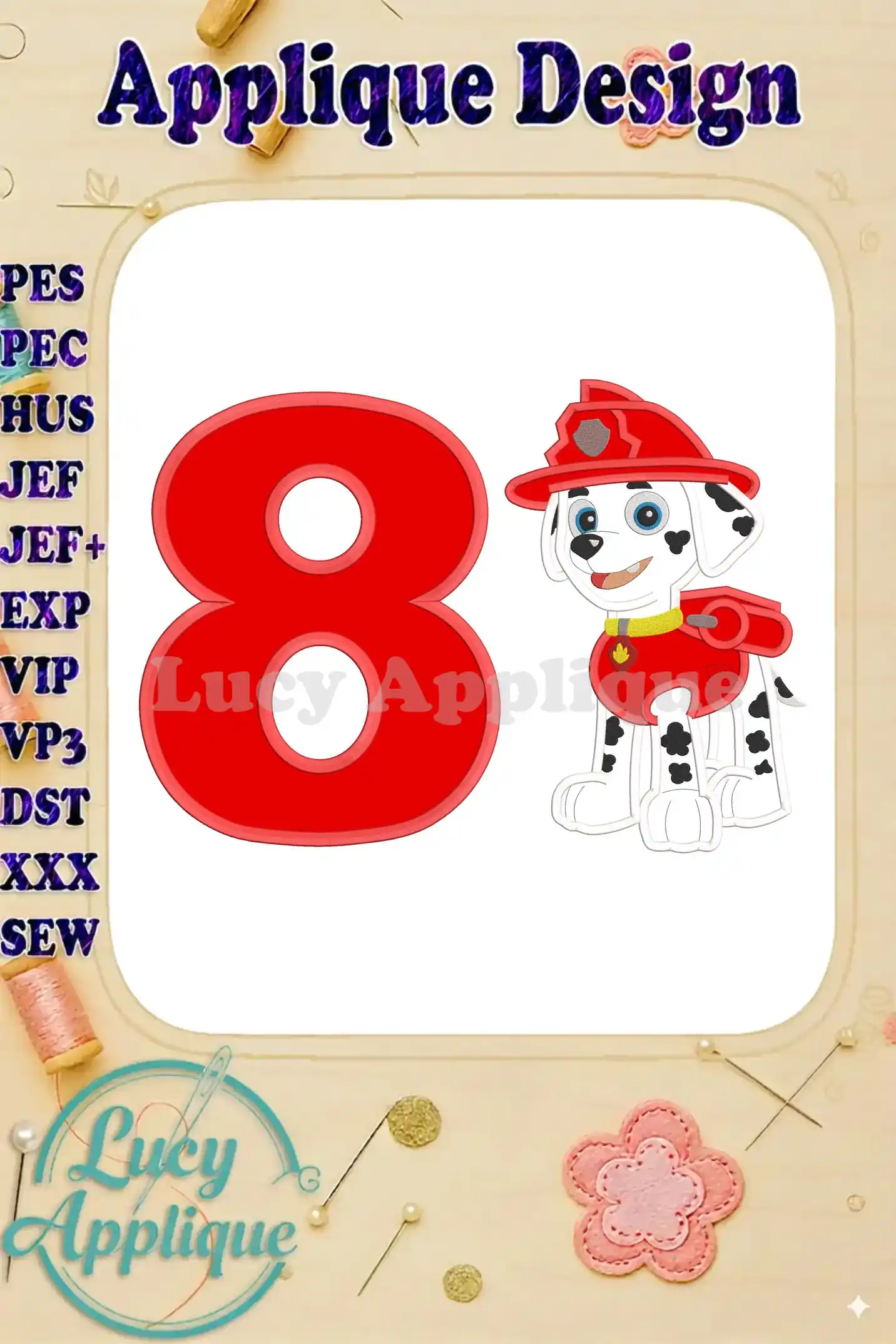 Marshall Paw Patrol Birthday Number 8 Applique Design – Instant Download