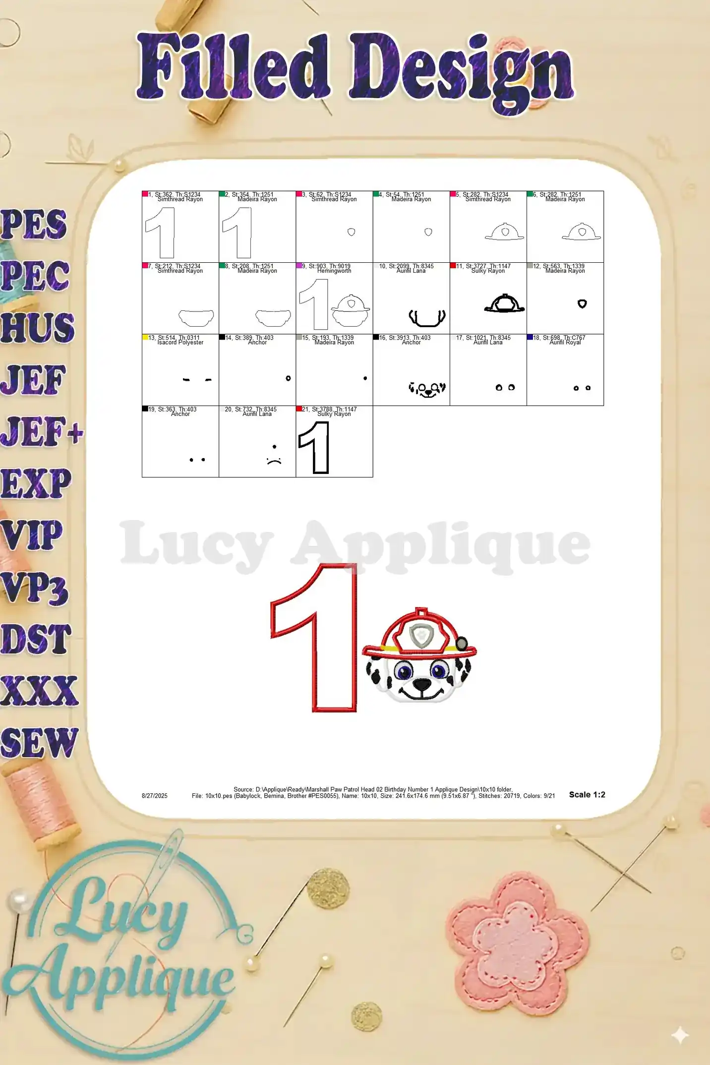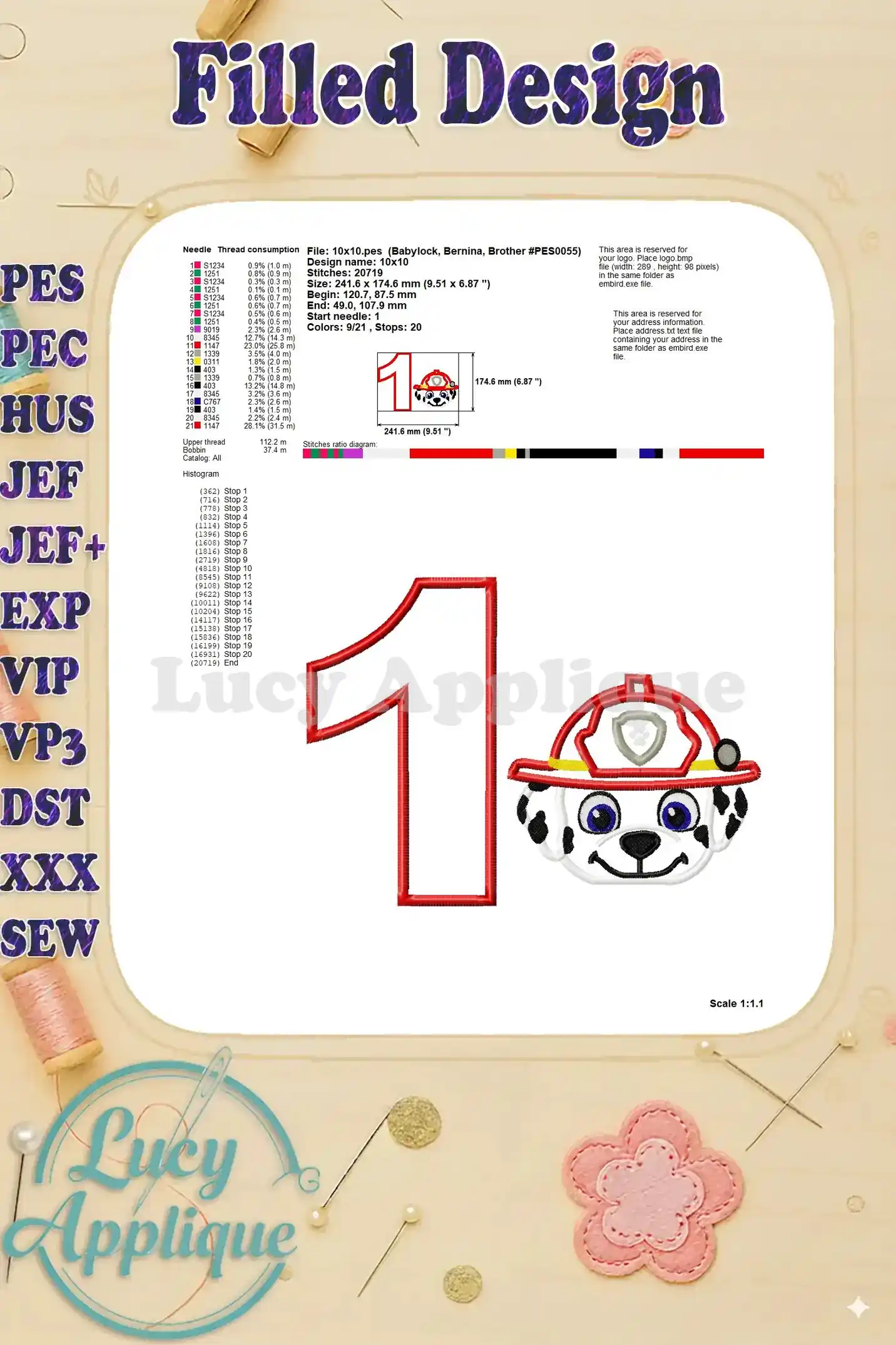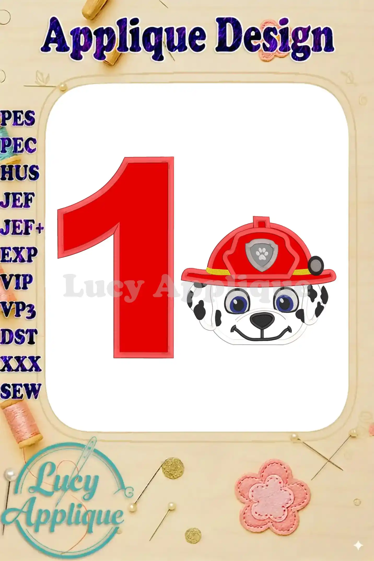 Marshall Paw Patrol Head 02 Birthday Number 1 Applique Design – Instant Download