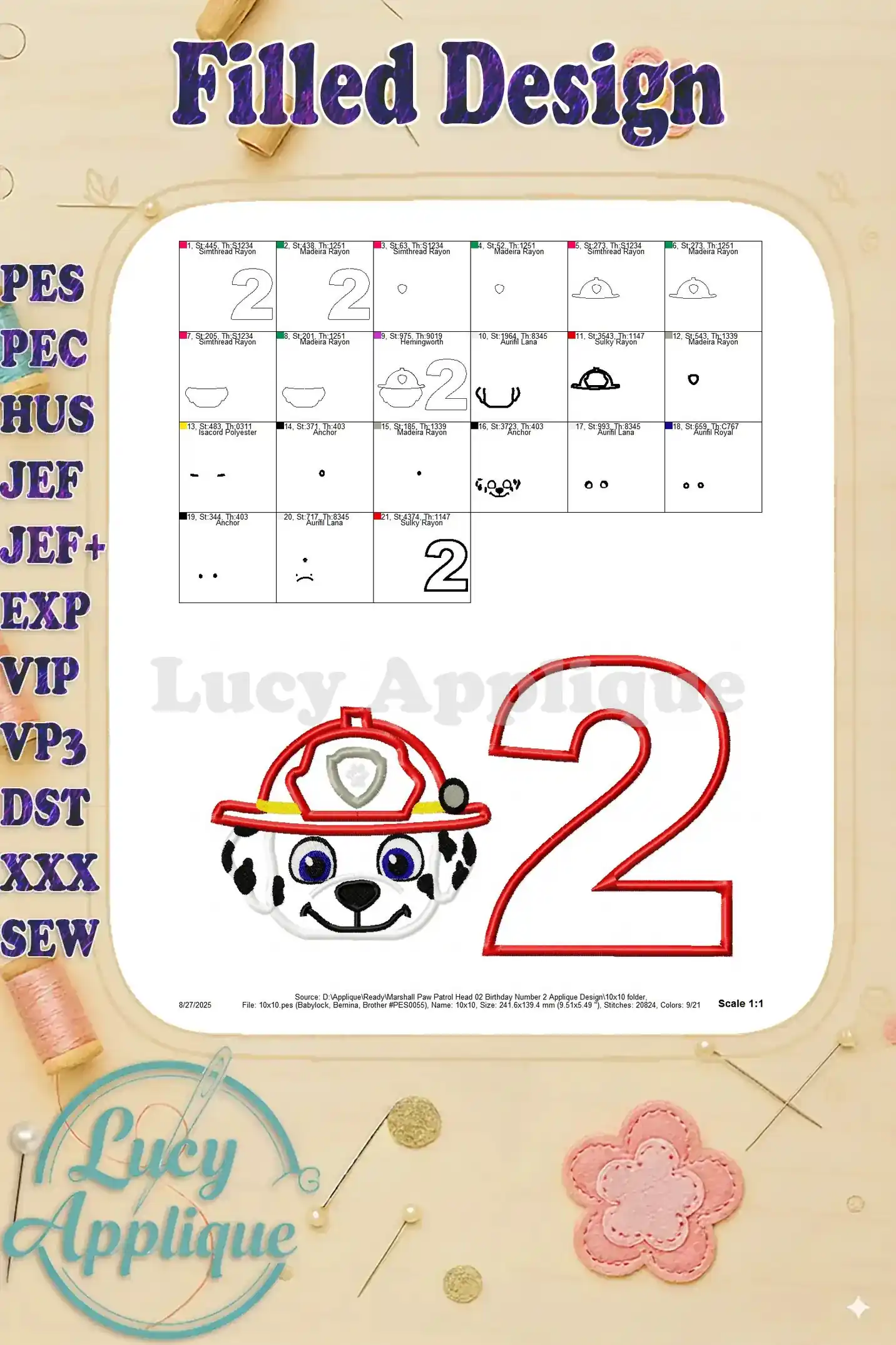Marshall Paw Patrol Head 02 Birthday Number 2 Applique Design – Instant Download