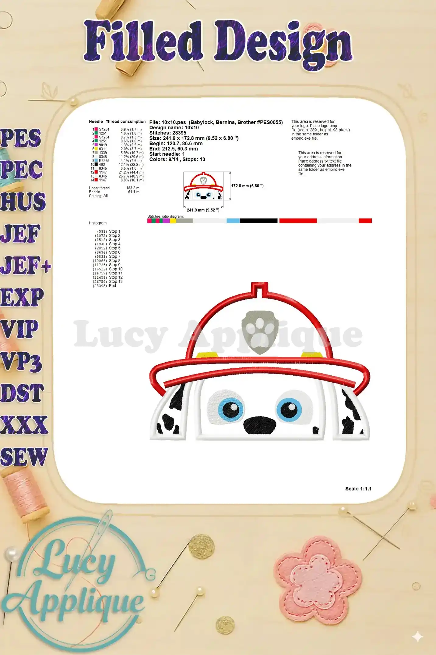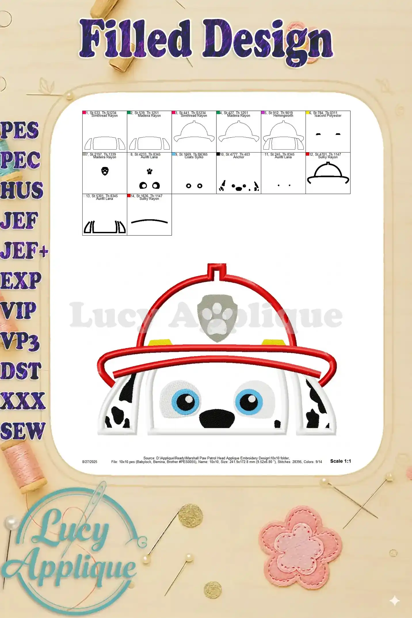 Adorable Marshall Paw Patrol applique embroidery design! Perfect for kids’ clothes, bags, or blankets. Easy-to-follow instructions and multiple formats included. Add a fun, playful touch to your sewing projects!