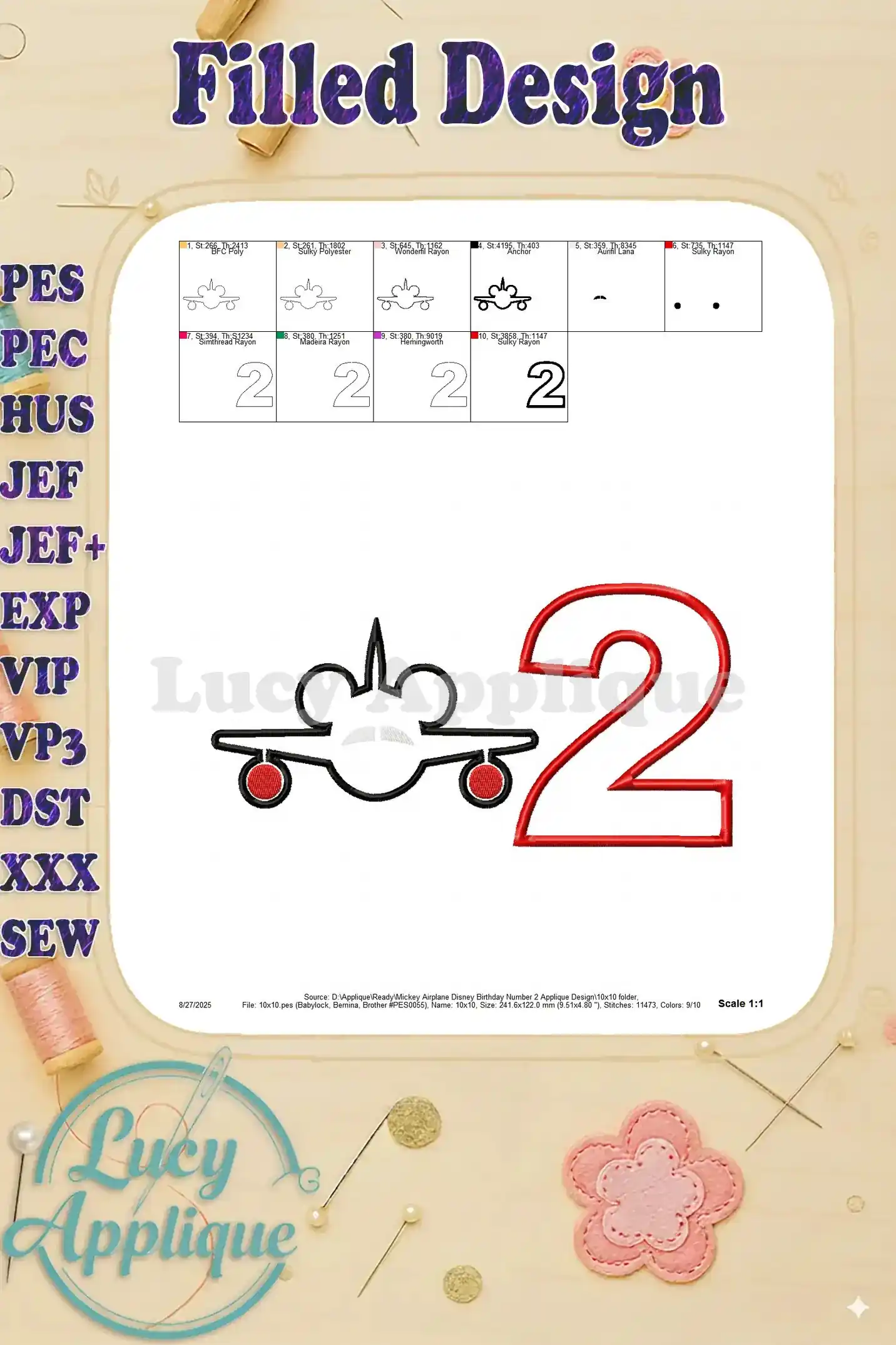 Mickey Airplane Disney Birthday Number 2 Applique Design – Instant Download