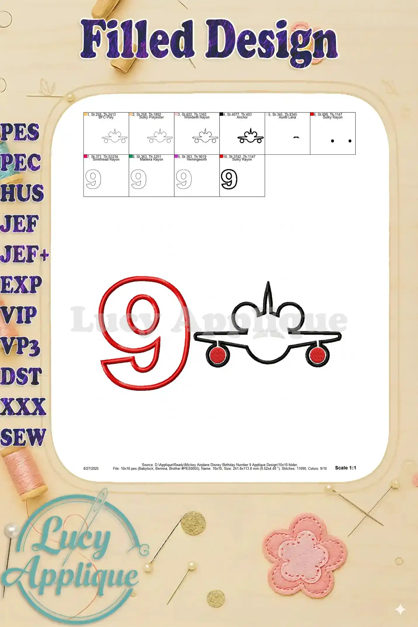 Mickey Airplane Disney Birthday Number 9 Applique Design – Instant Download
