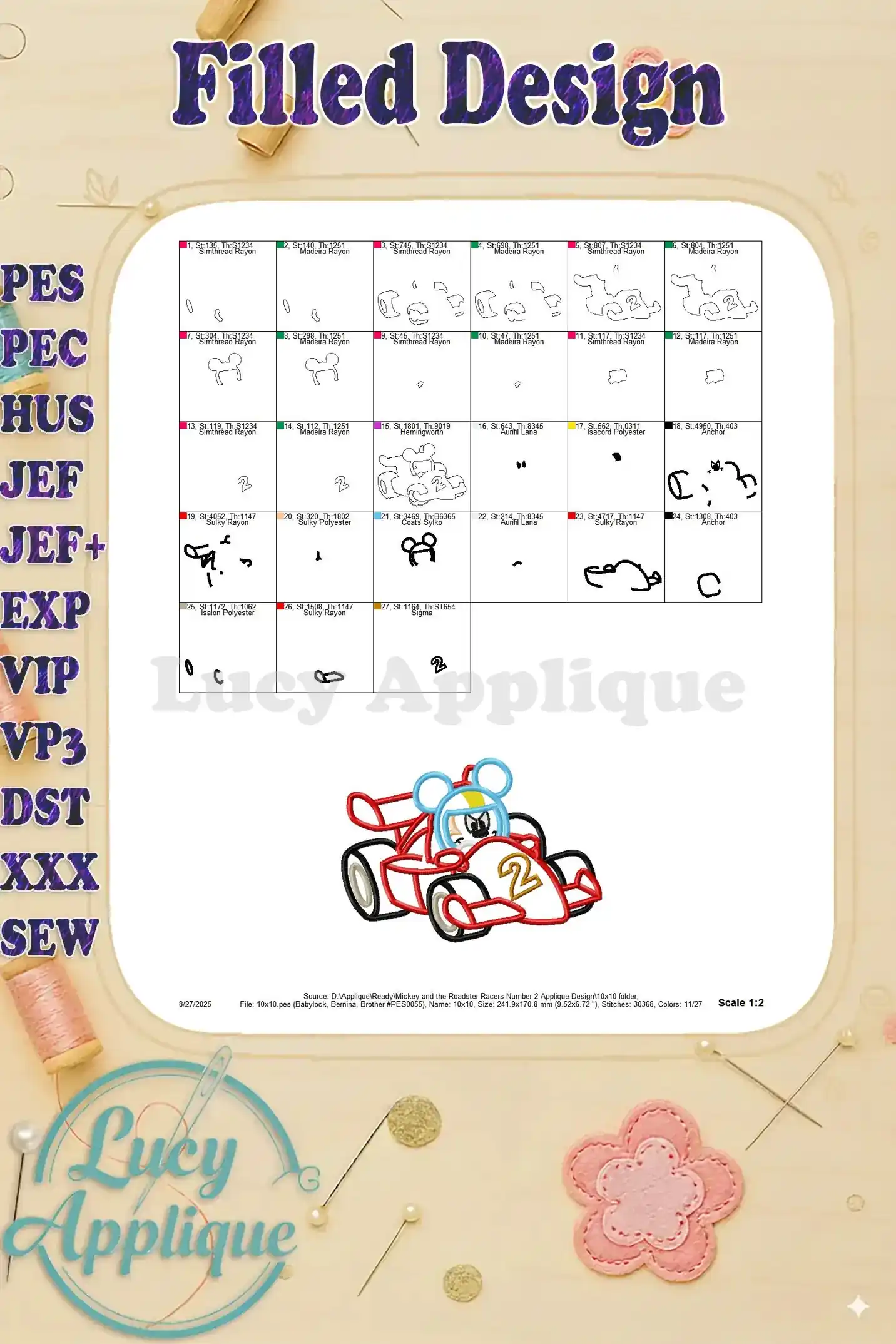 Adorable Mickey Mouse Roadster Racer applique embroidery design! Perfect for adding a fun, playful touch to kids’ clothing, bags, or home decor. High-quality design, easy to stitch.