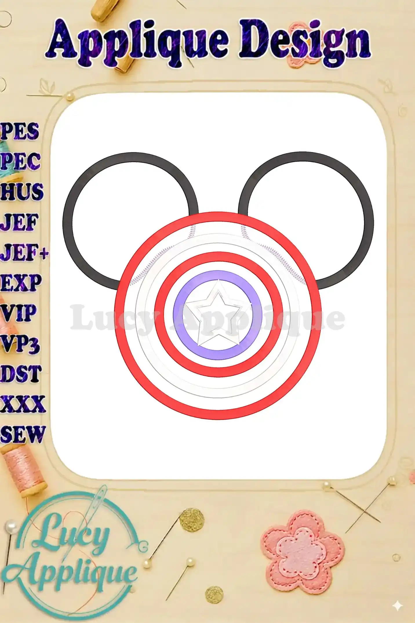 Adorable Mickey Mouse ears with Captain America’s shield! This applique embroidery design is perfect for adding a touch of playful patriotism to your projects. Get it now!