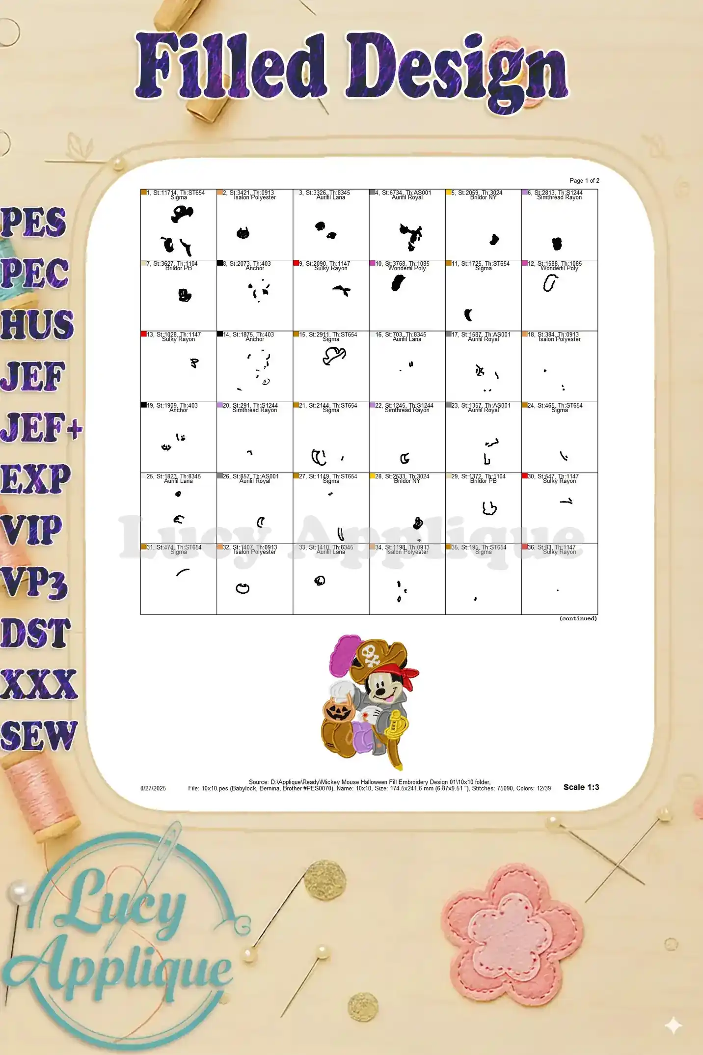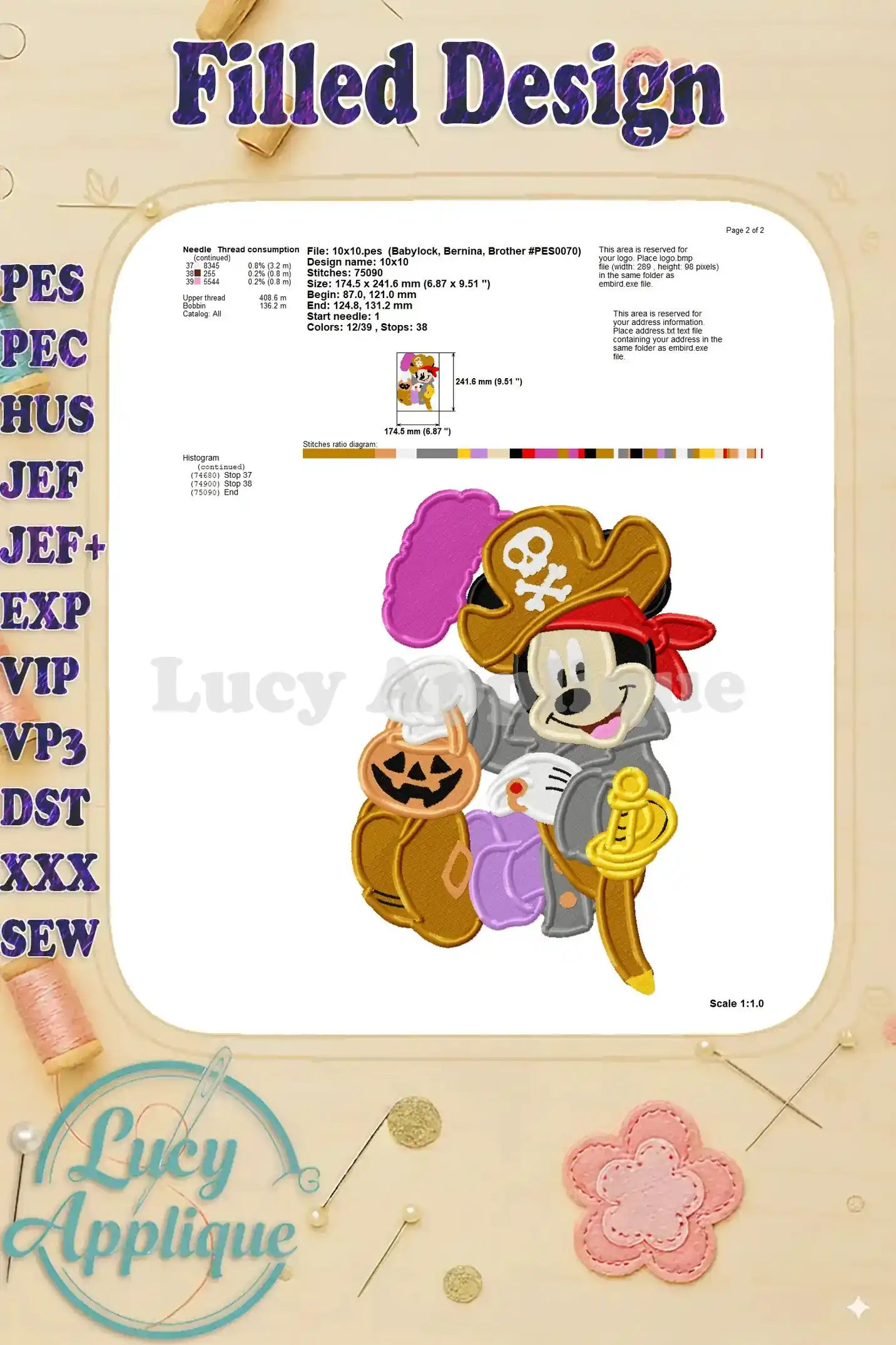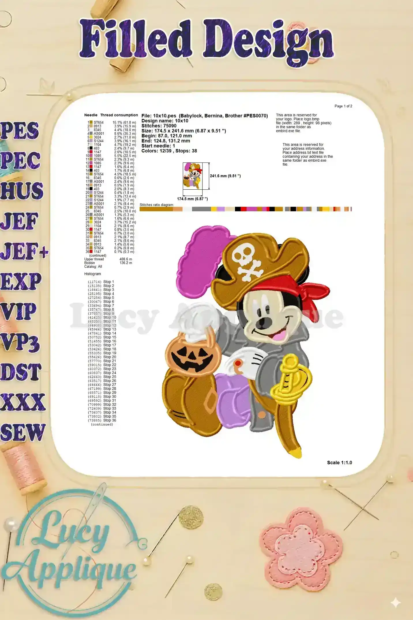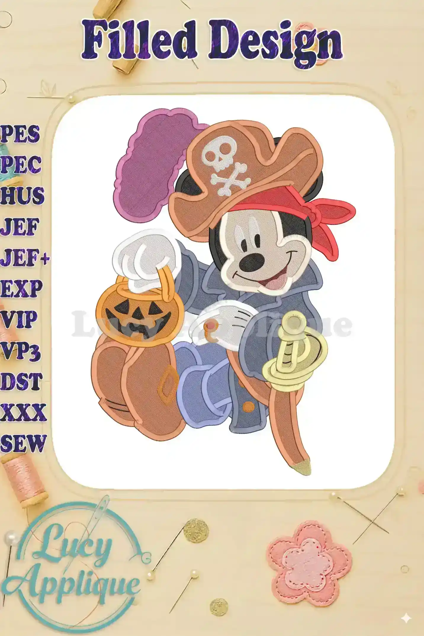 Adorable Mickey Mouse Halloween pirate design! Perfect for embroidery projects, this filled design is spooky and fun, adding a festive touch to your creations. Download now!