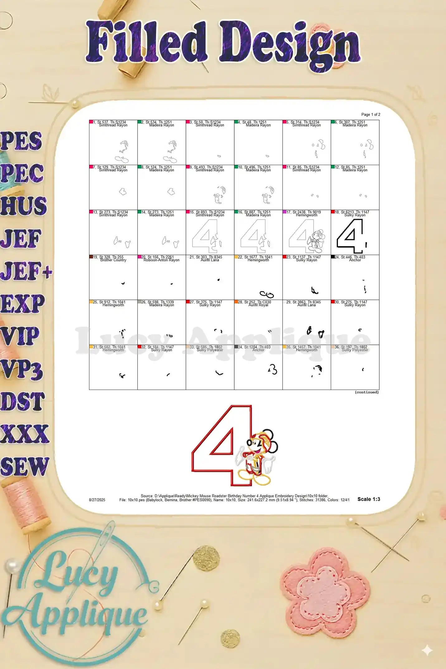 Mickey Mouse Roadster Birthday Number 4 Applique Embroidery Design – Instant Download