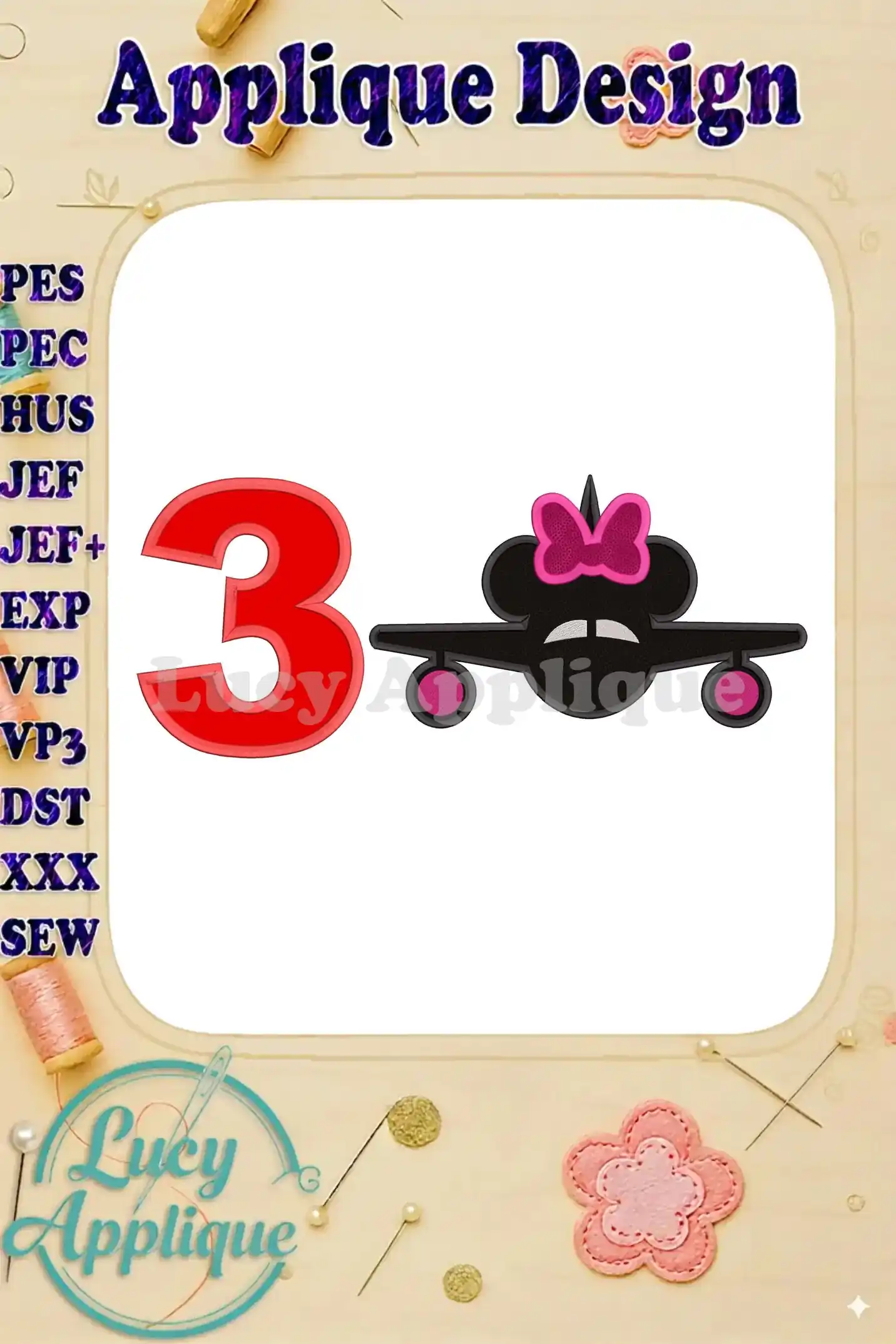 Minnie Airplane Disney Birthday Number 3 Applique Design – Instant Download