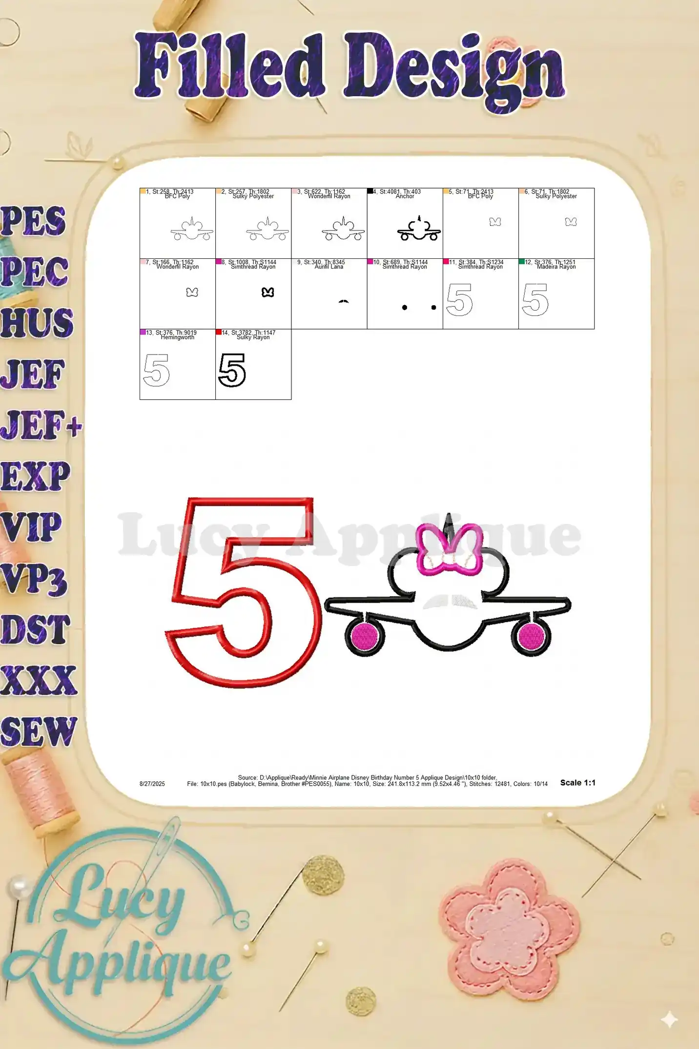 Minnie Airplane Disney Birthday Number 5 Applique Design – Instant Download