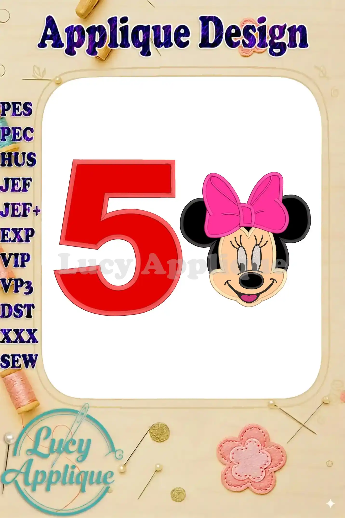 Minnie Mouse Birthday Number 5 Applique 03 Design – Instant Download