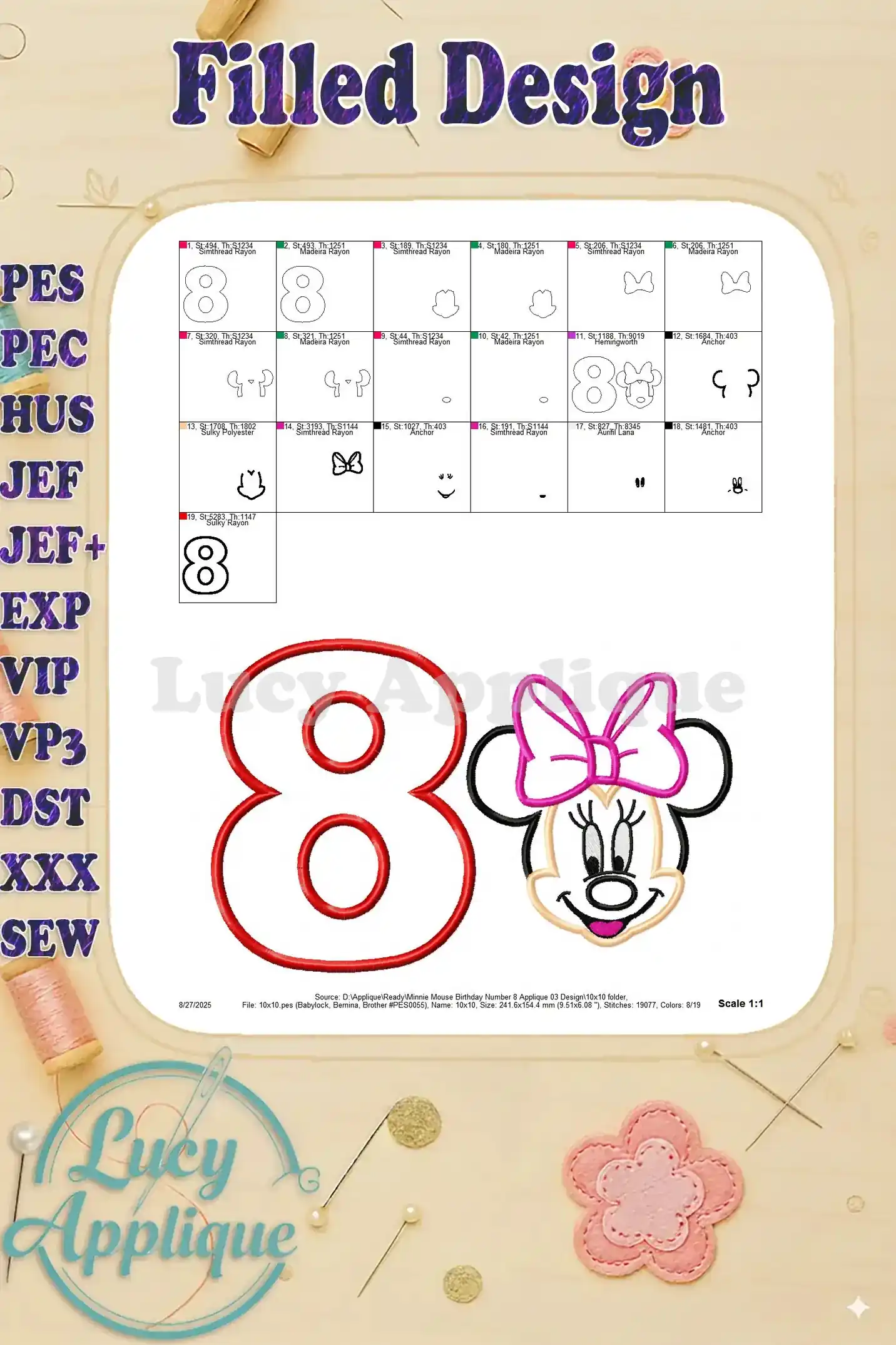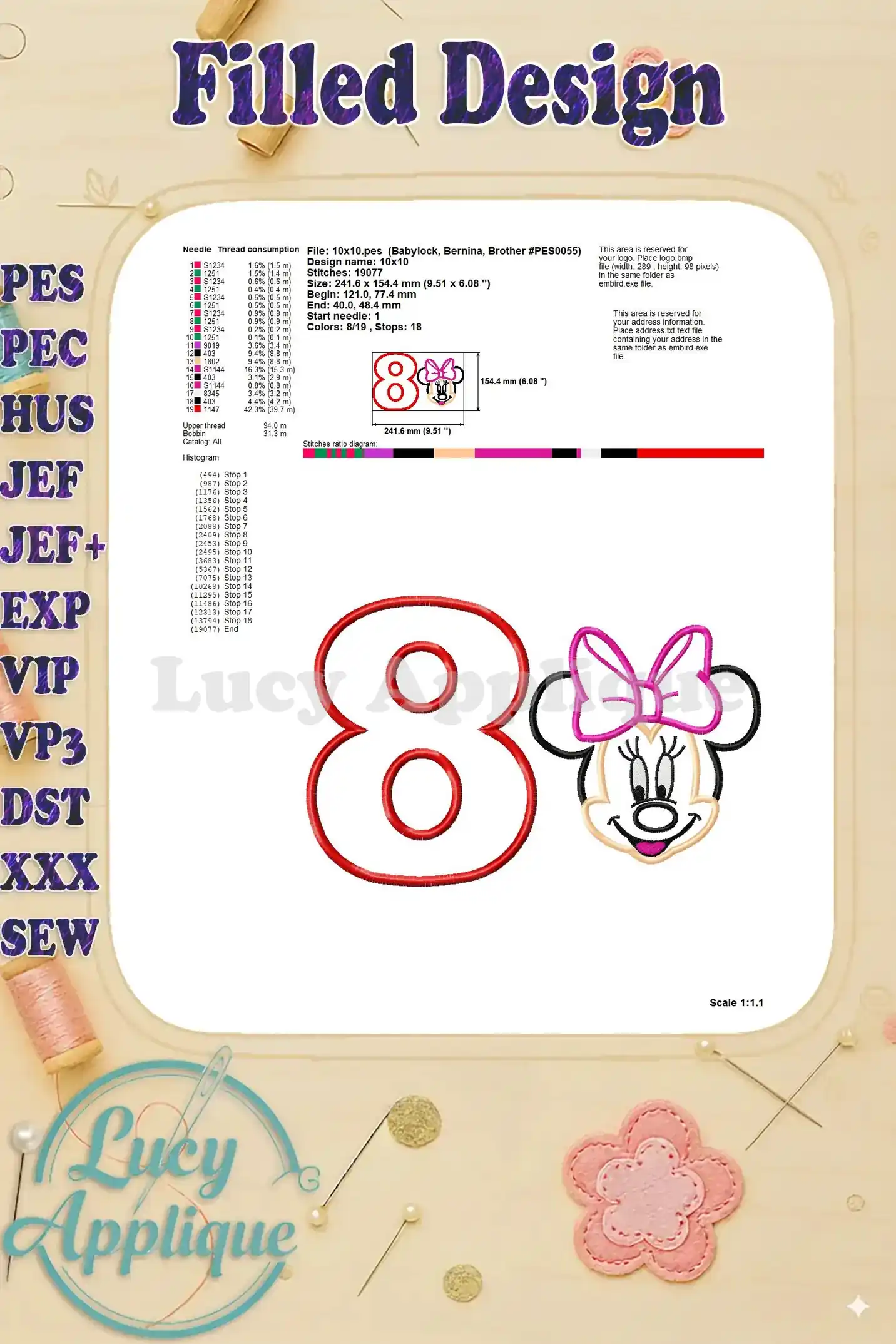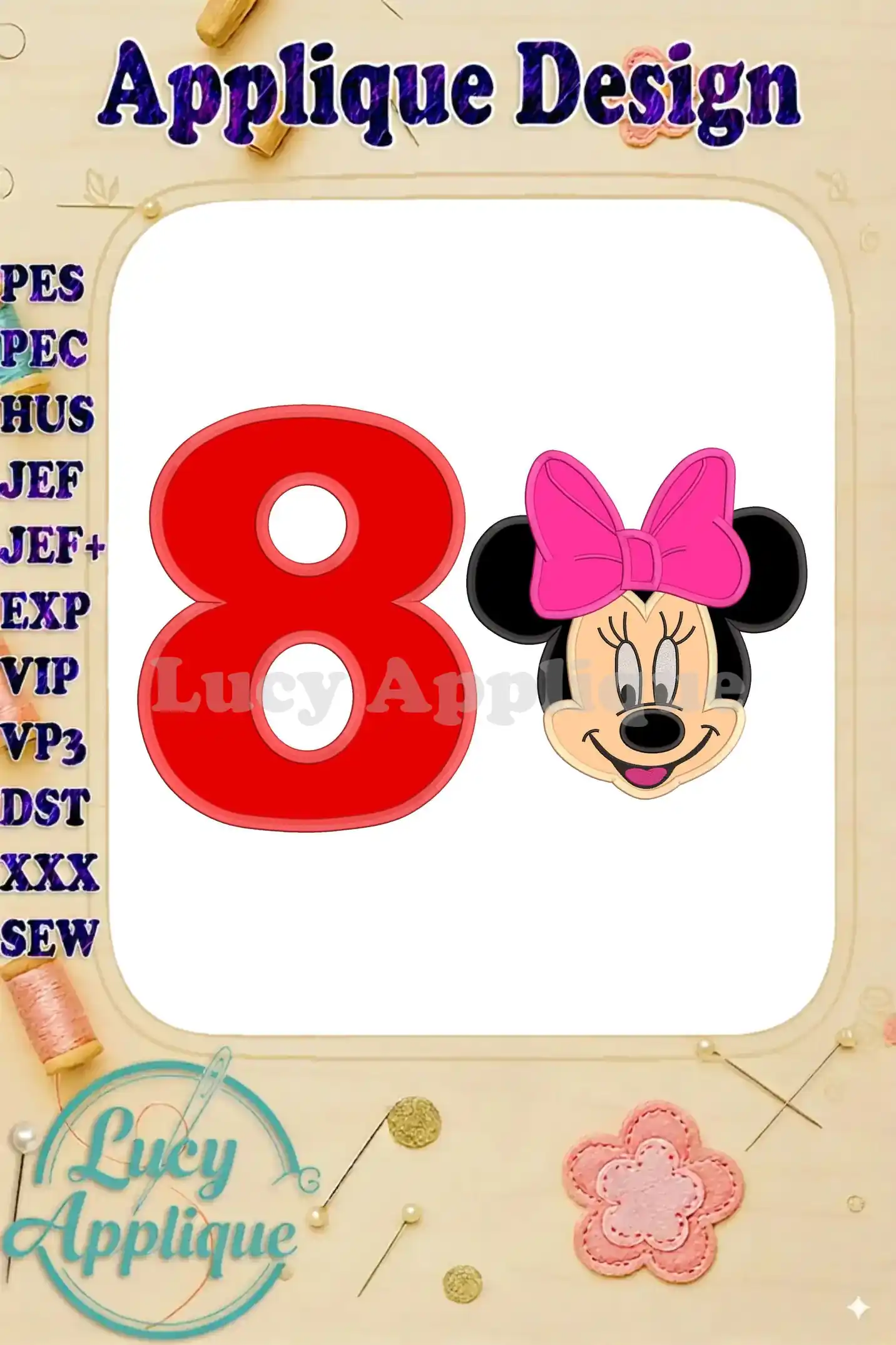 Minnie Mouse Birthday Number 8 Applique 03 Design – Instant Download