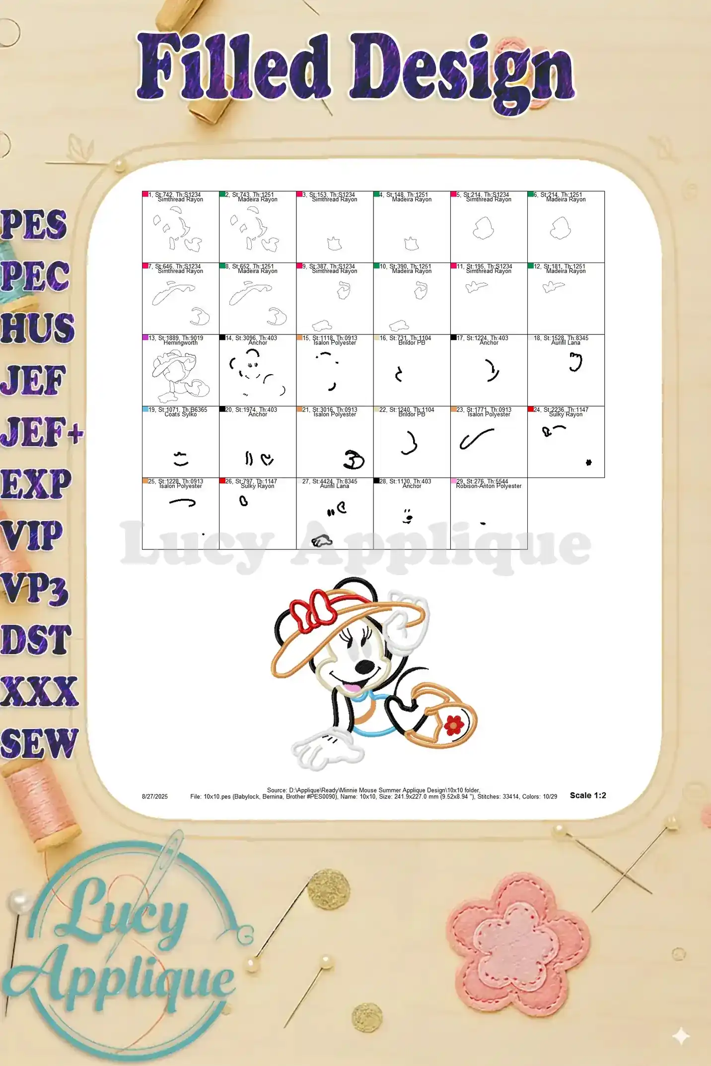 Adorable Minnie Mouse summer applique embroidery design! Perfect for clothing, bags, or home decor. Easy-to-follow instructions included. Add a touch of Disney magic to your projects!