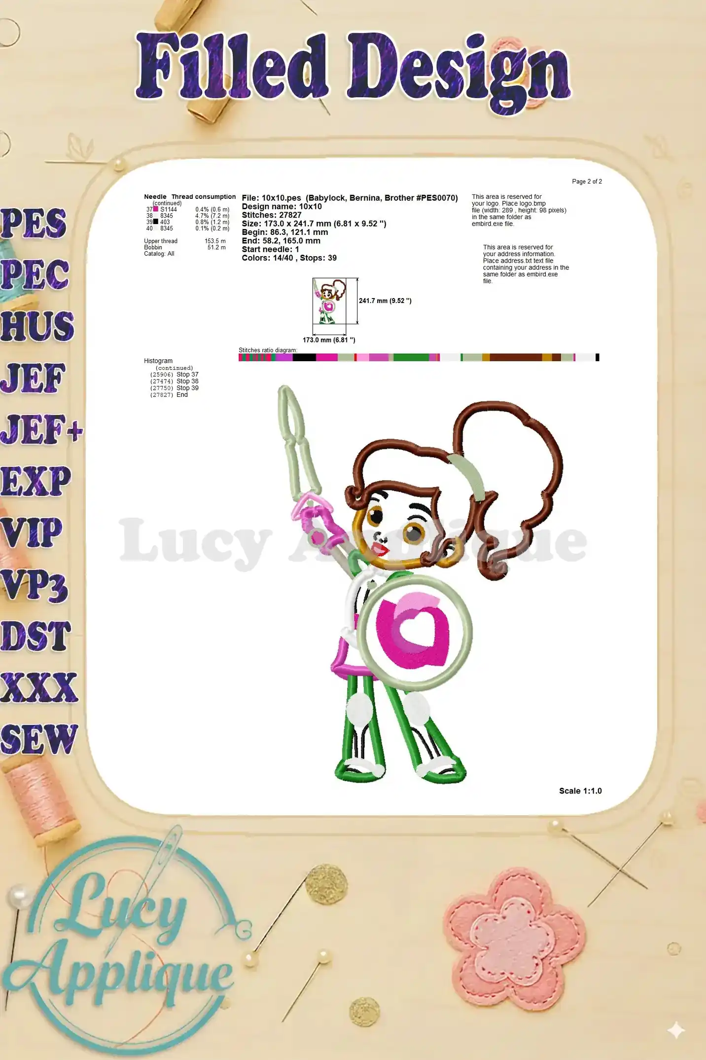 Adorable Nella the Princess Knight applique design! Perfect for kids’ clothing, blankets, or crafts. High-quality embroidery pattern for easy stitching. Download now!