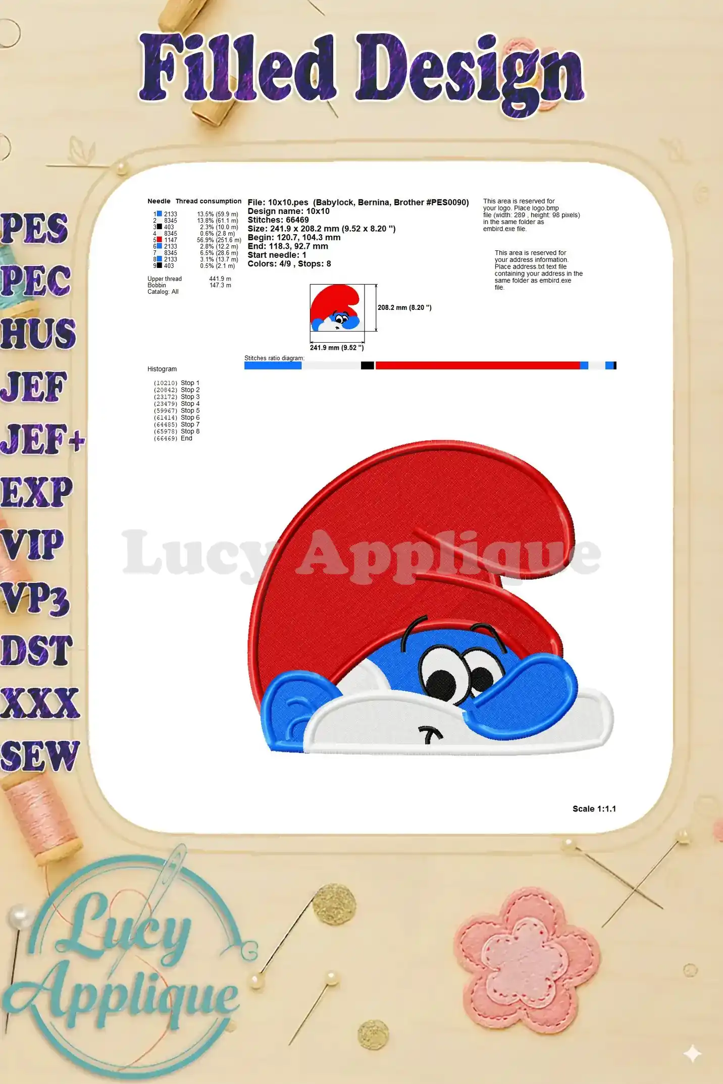 Adorable Papa Smurf embroidery design! Perfect for adding a touch of Smurf village charm to your projects. Filled stitch design, easy to stitch out.