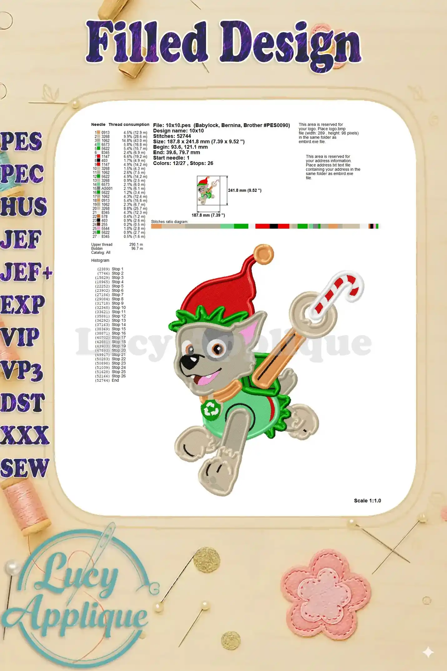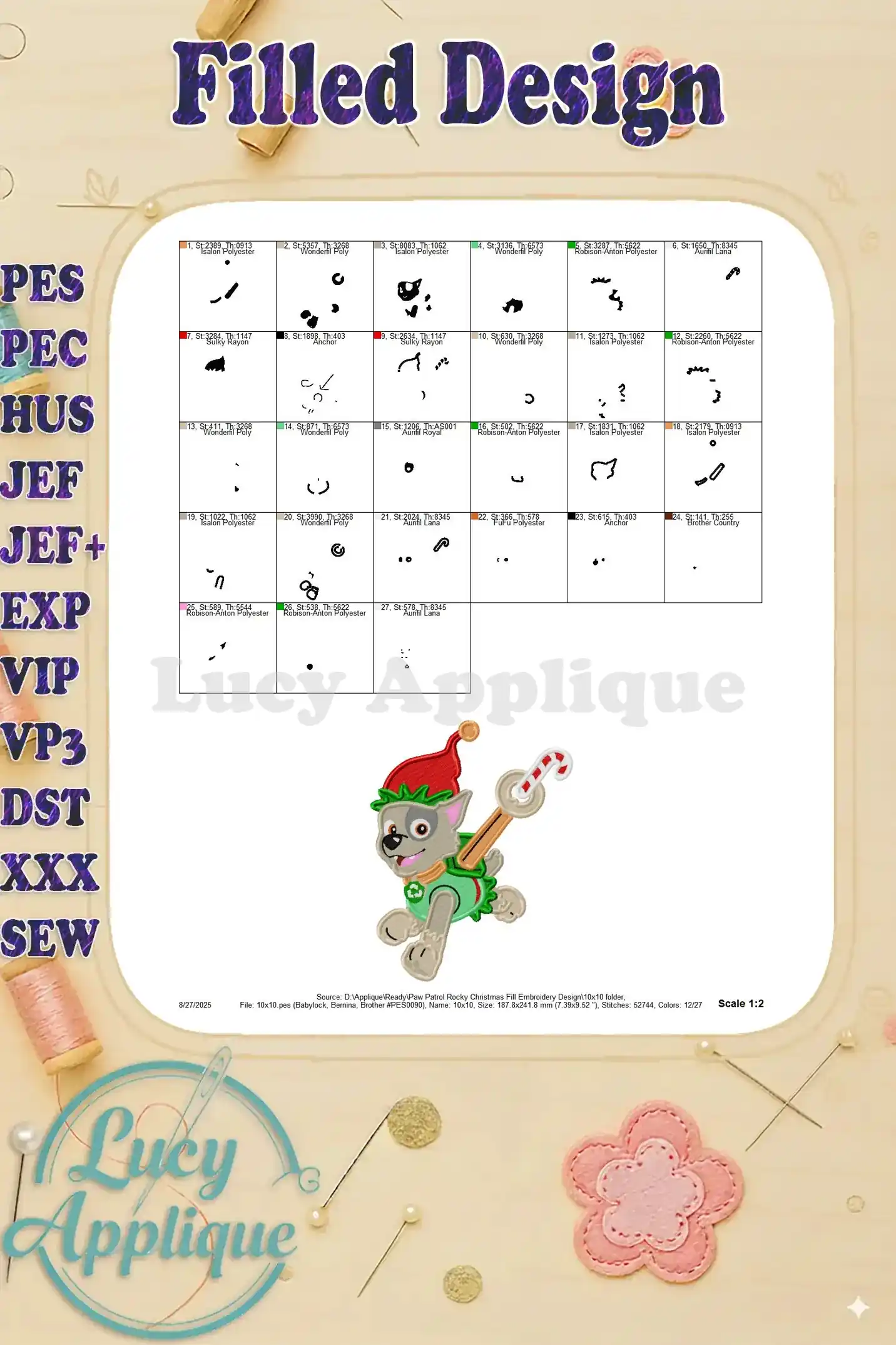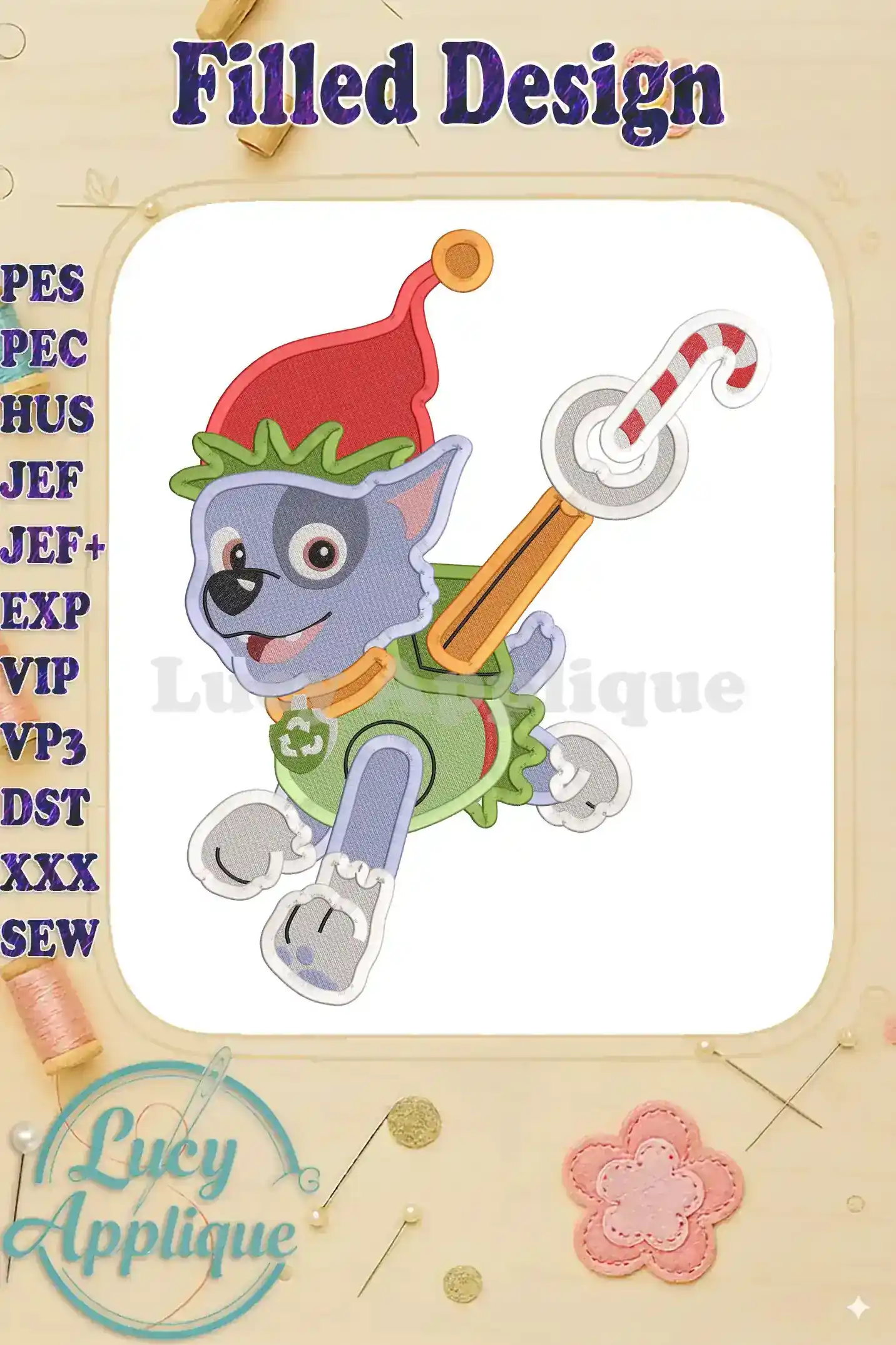 Paw Patrol Rocky Christmas Fill Embroidery Design – Instant Download