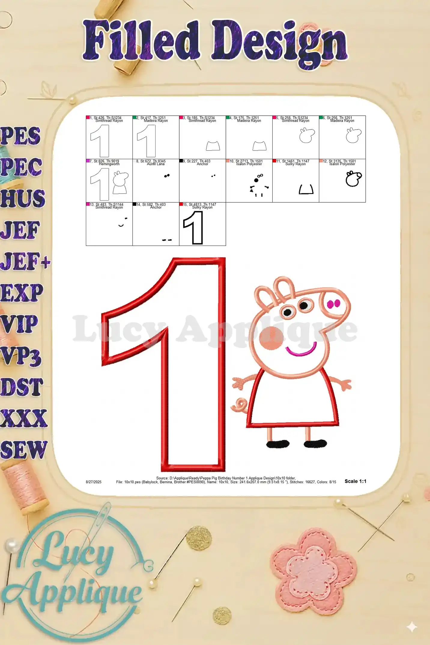 Peppa Pig Birthday Number 1 Applique Design – Instant Download