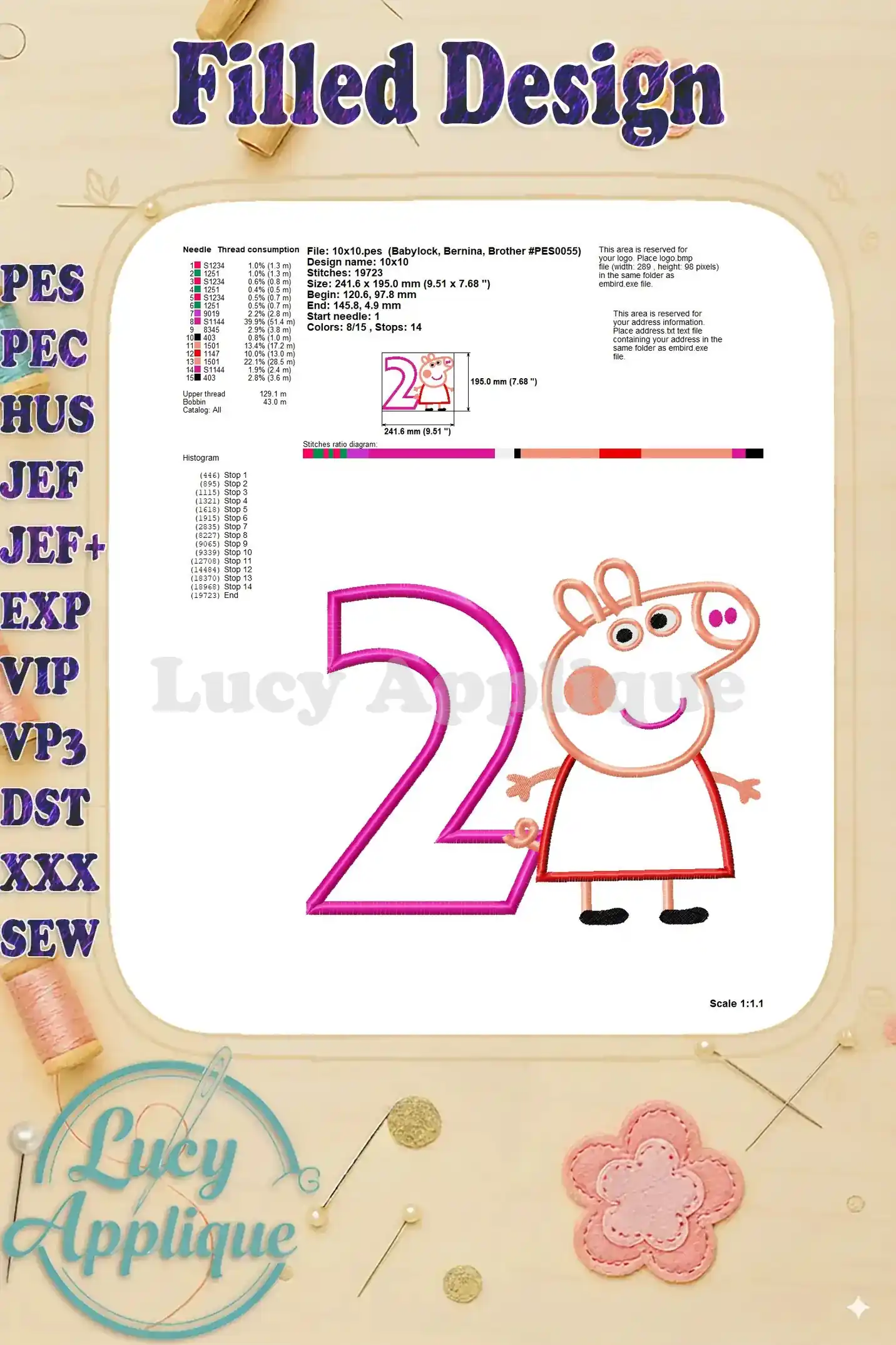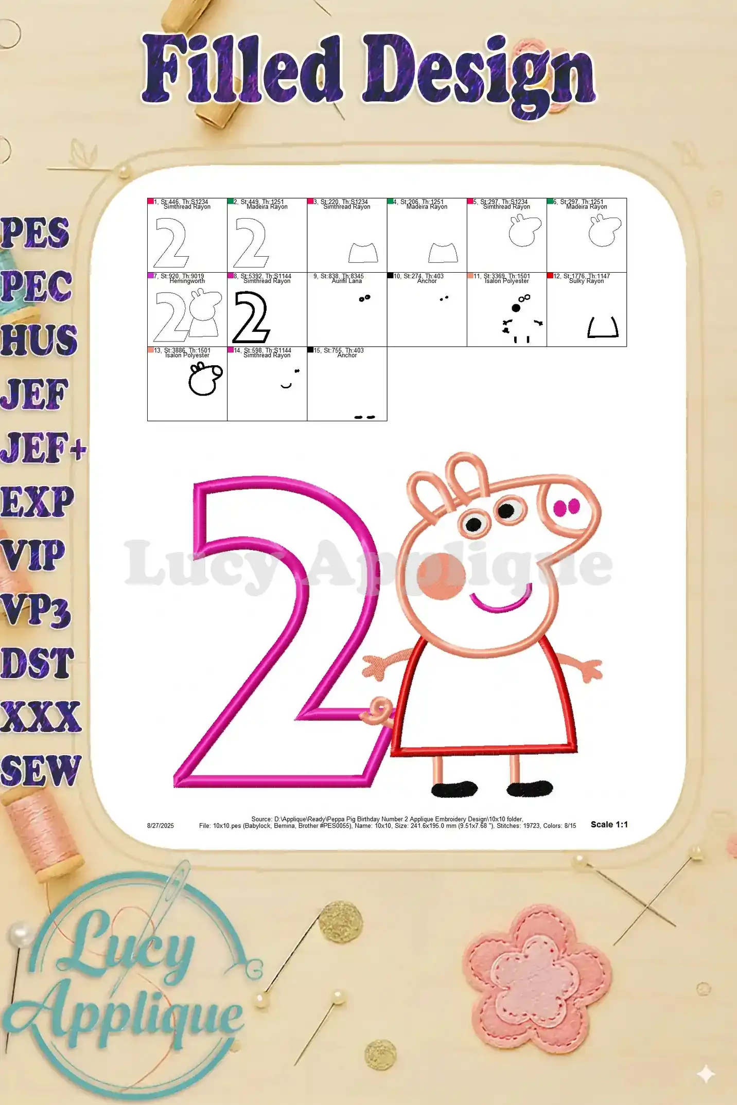 Peppa Pig Birthday Number 2 Applique Embroidery Design – Instant Download