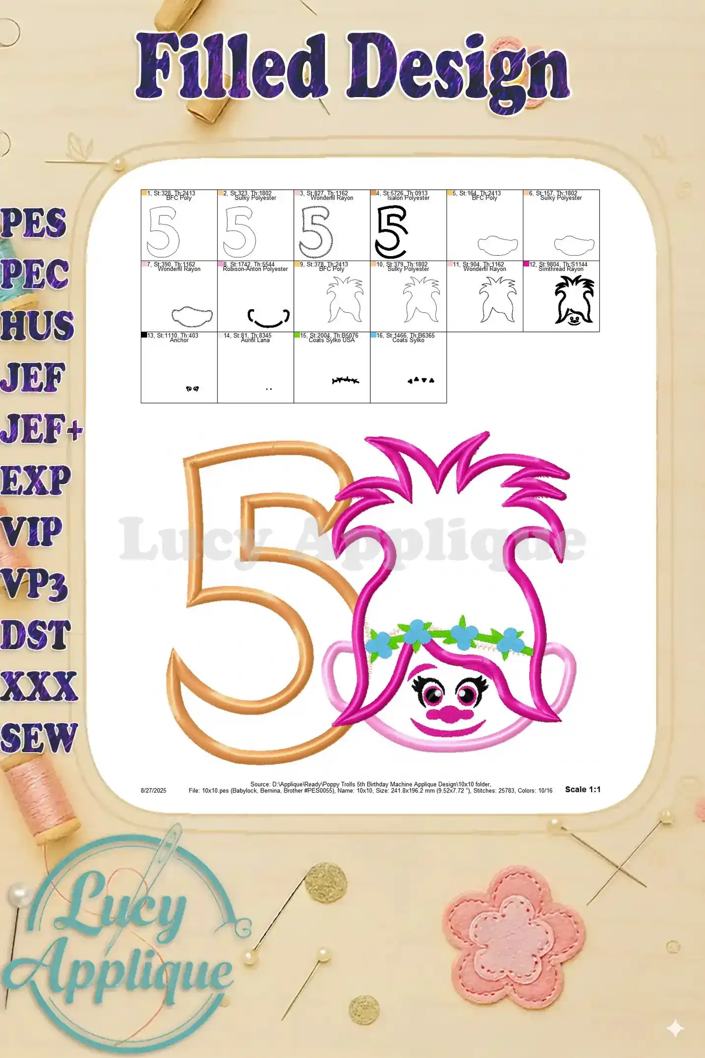 Poppy Trolls 5th Birthday Machine Applique Design – Instant Download