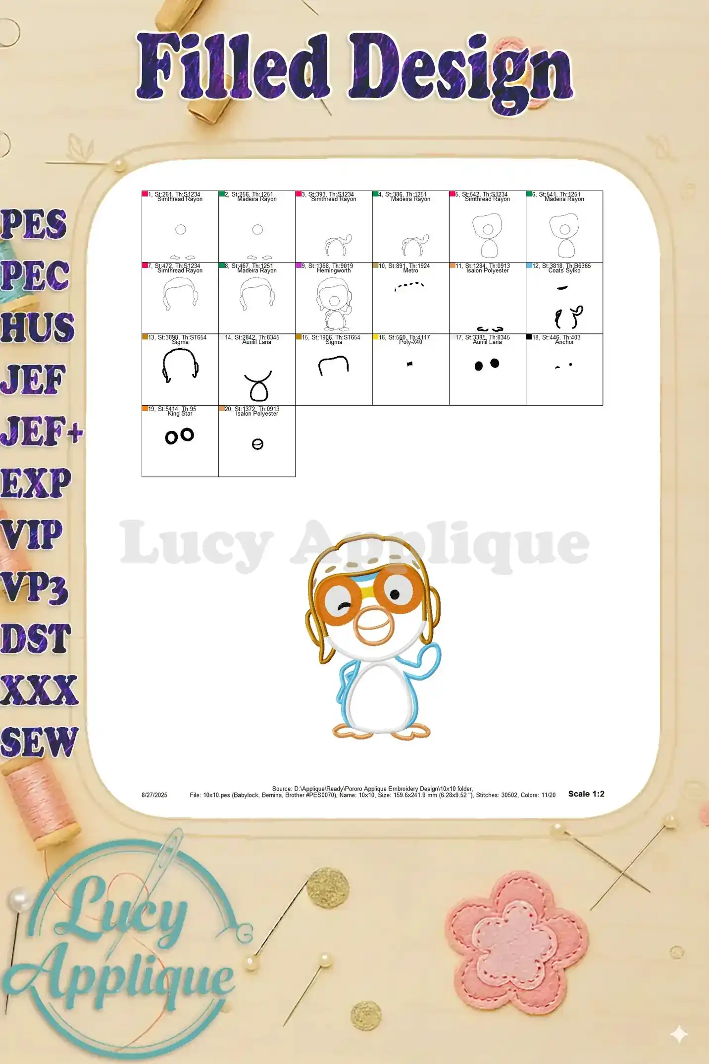 Adorable Pororo penguin applique embroidery design! Perfect for kids’ clothes, bags, or home decor. Easy-to-follow instructions and multiple file formats included. Get yours now!