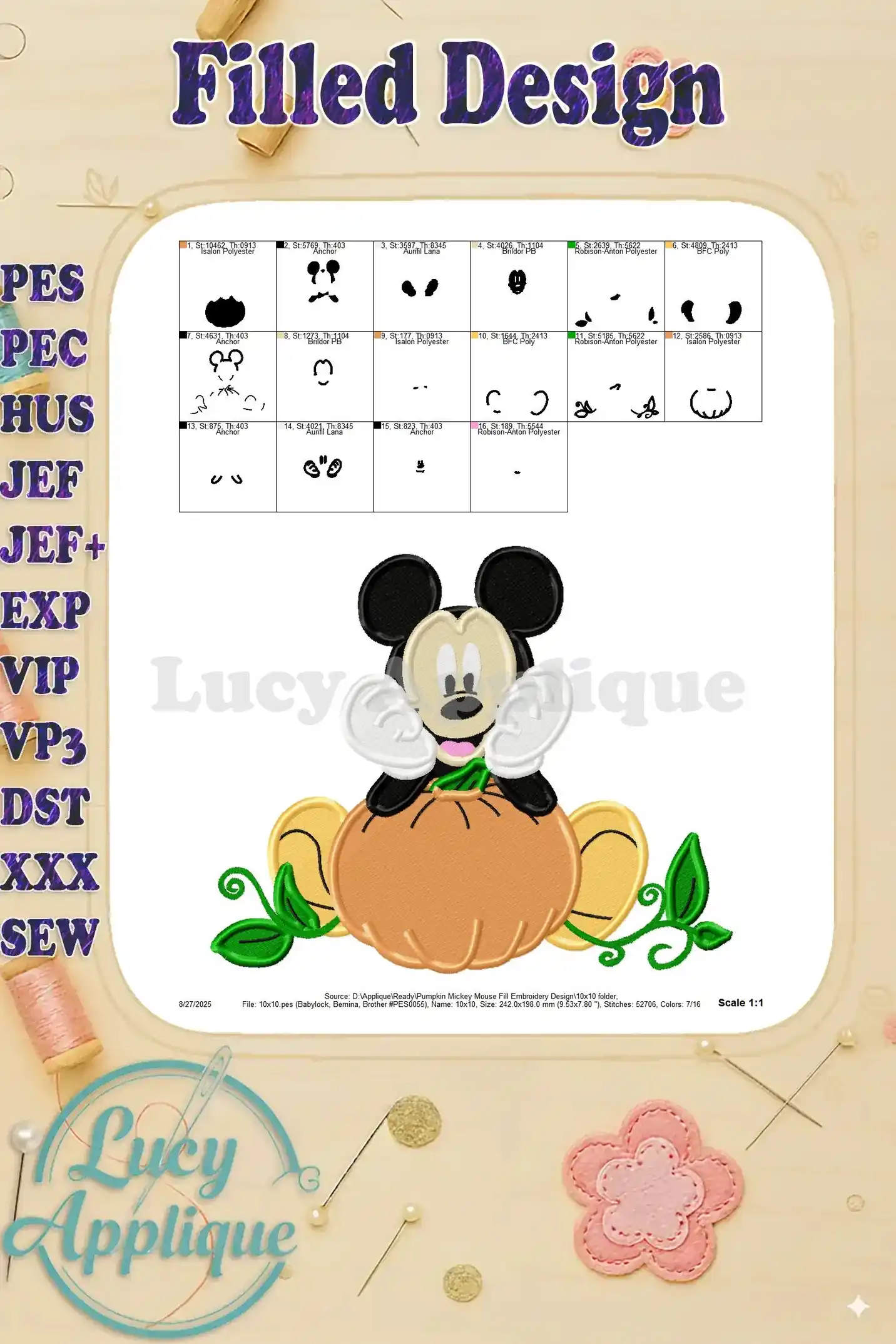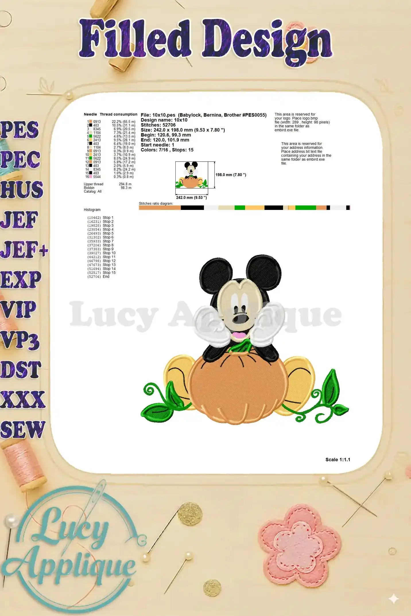 Pumpkin Mickey Mouse Fill Embroidery Design – Instant Download