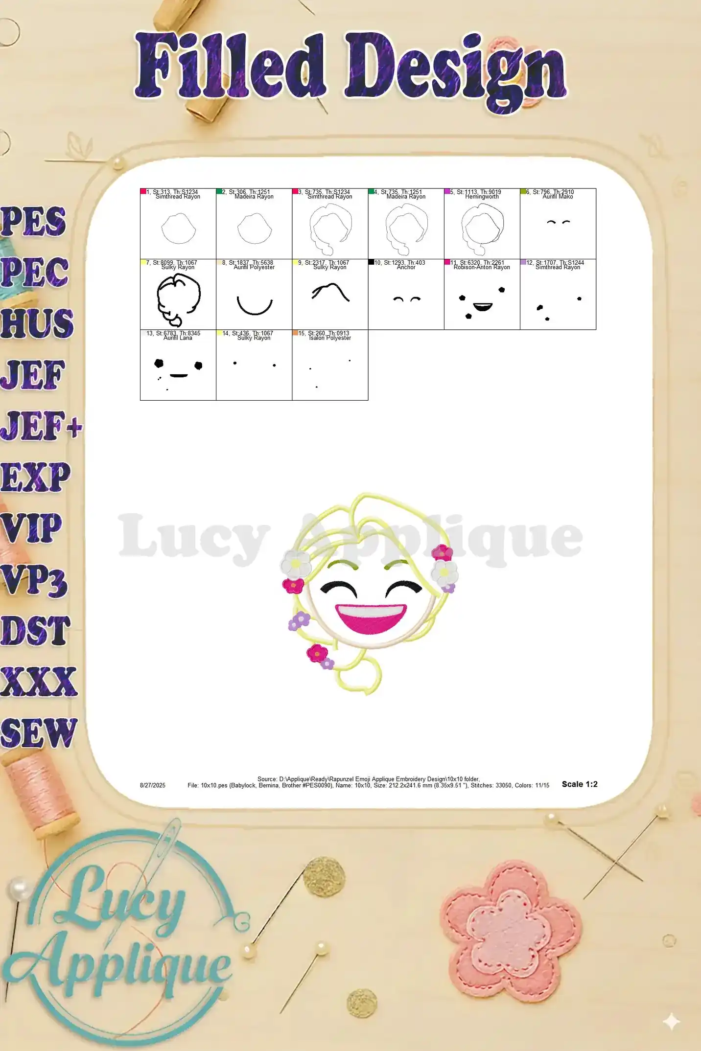 Rapunzel Emoji Applique Embroidery Design – Instant Download