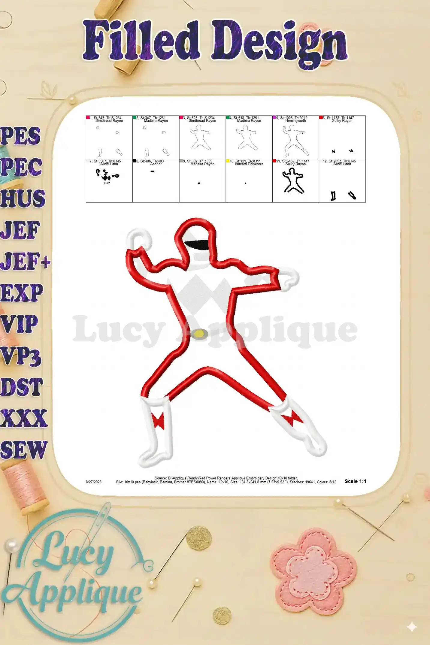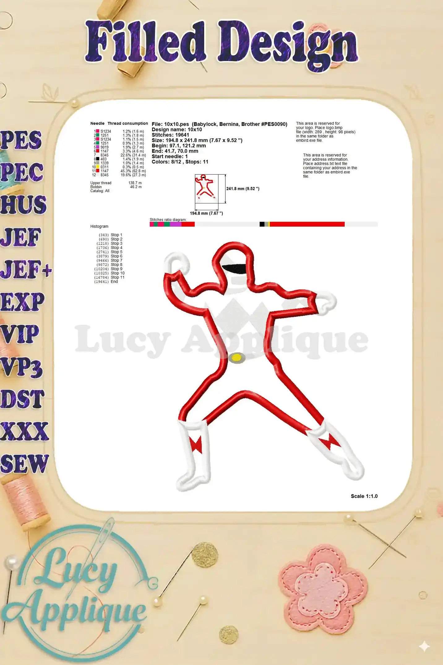 Embroider the iconic Red Power Ranger! This applique design is perfect for adding a pop of color and nostalgia to your projects. High-quality design, easy to follow instructions. Get yours now!