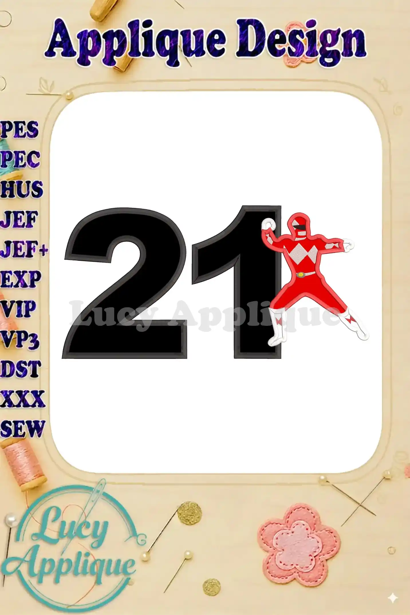 Red Power Rangers Birthday Number 21 Applique Embroidery Design – Instant Download