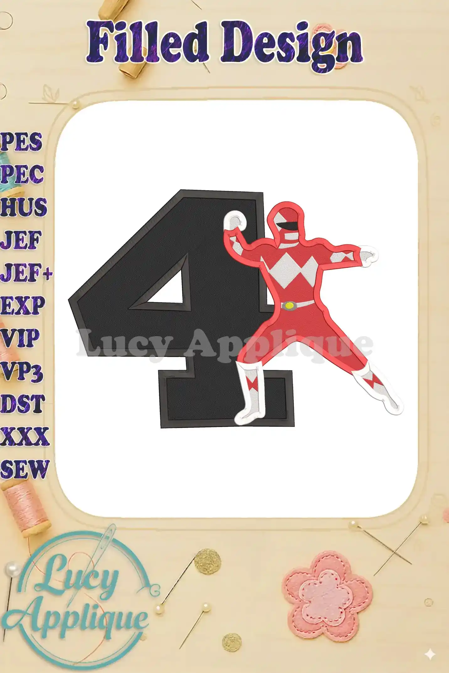 Red Power Rangers Birthday Number 4 Fill Machine Embroidery Design – Instant Download