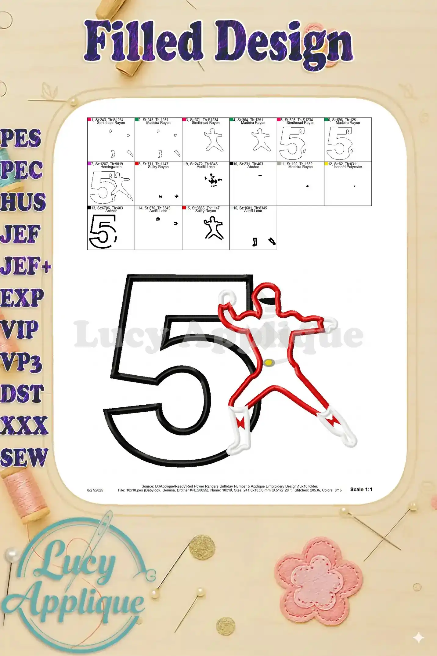 Red Power Rangers Birthday Number 5 Applique Embroidery Design – Instant Download