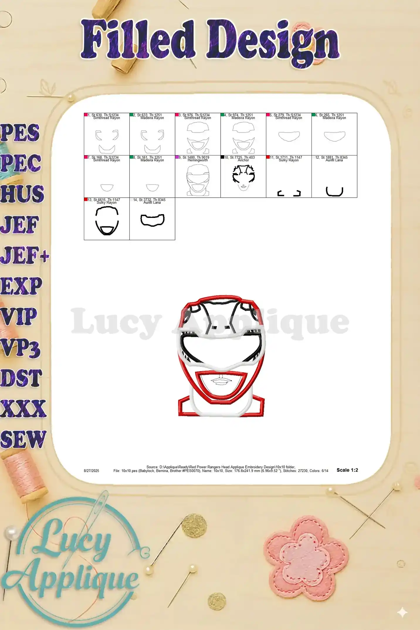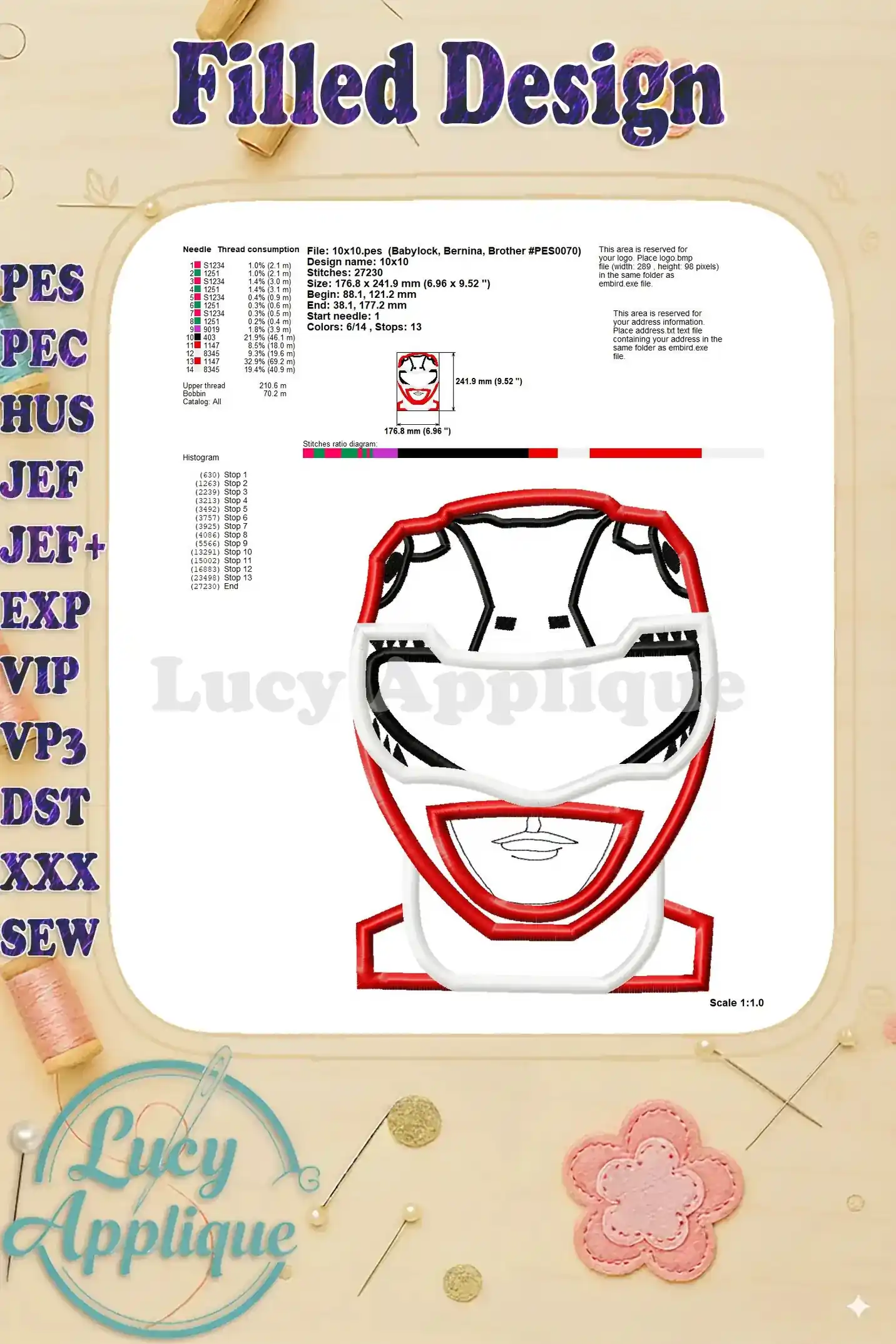 Red Power Rangers Head Applique Embroidery Design – Instant Download