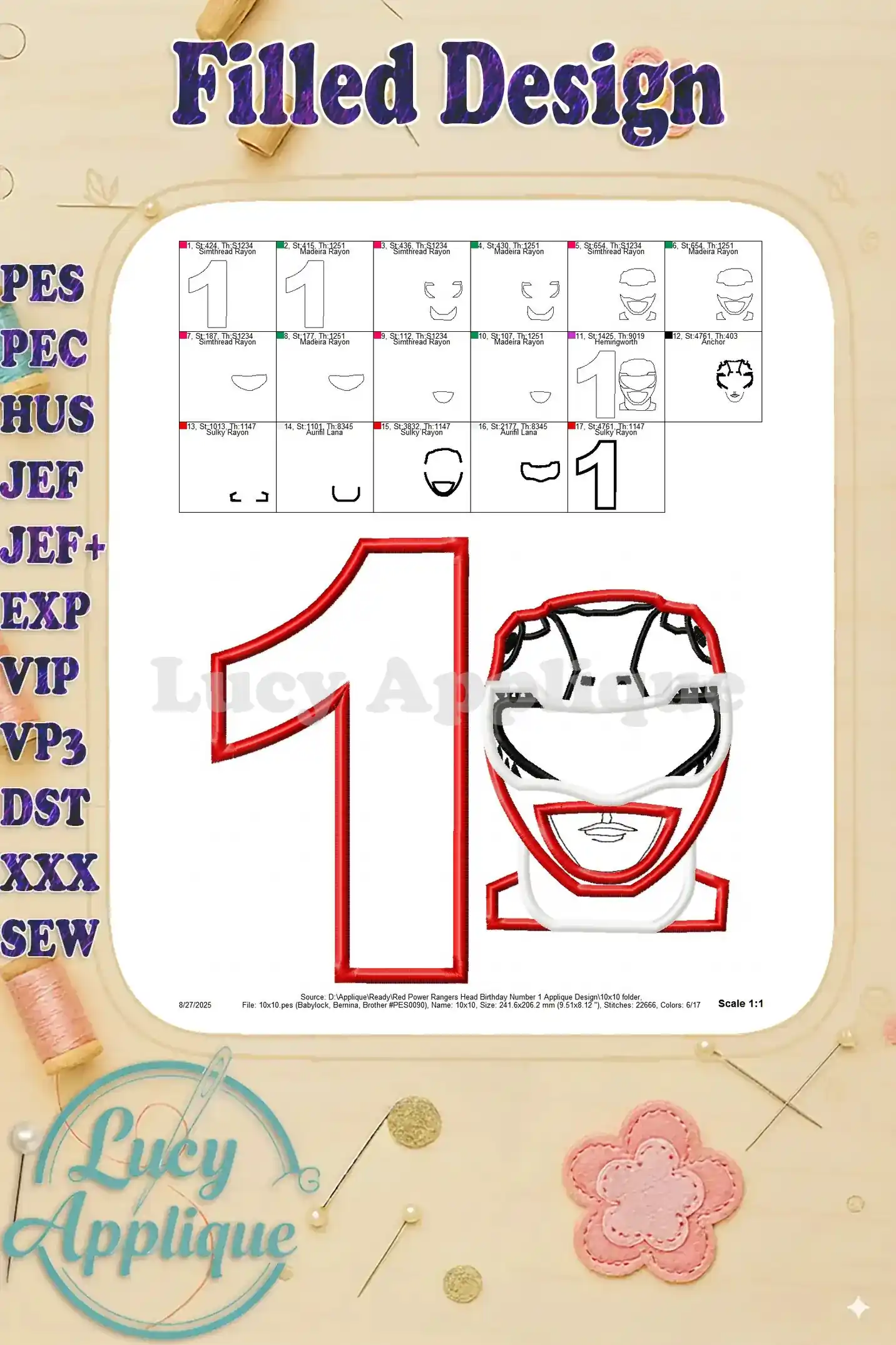 Red Power Rangers Head Birthday Number 1 Applique Design – Instant Download