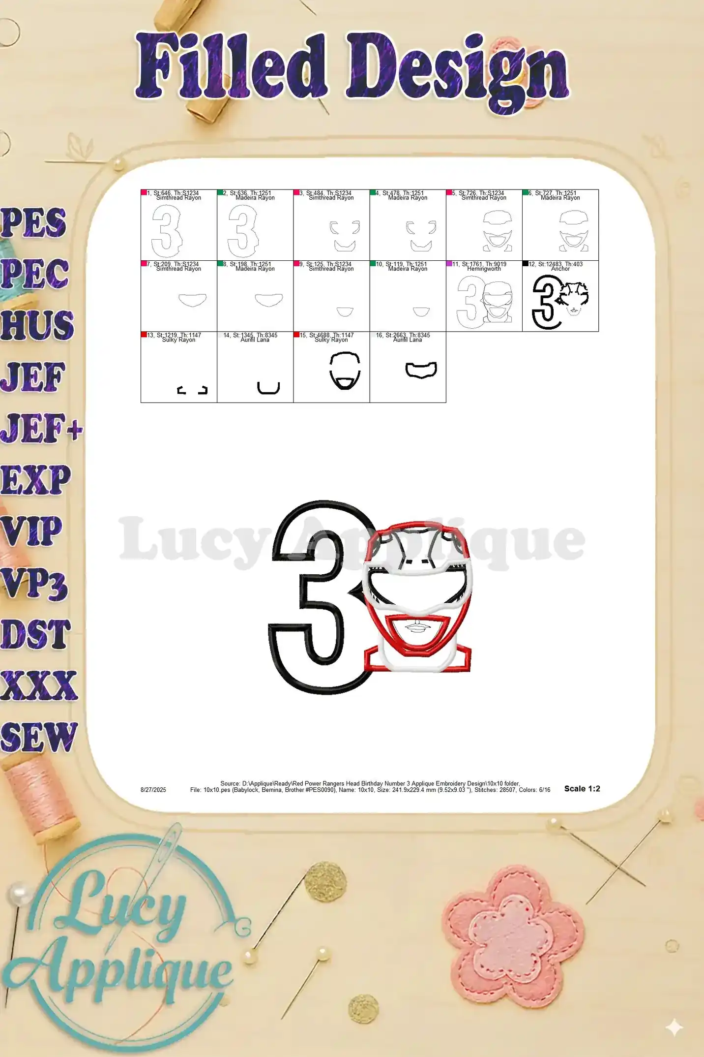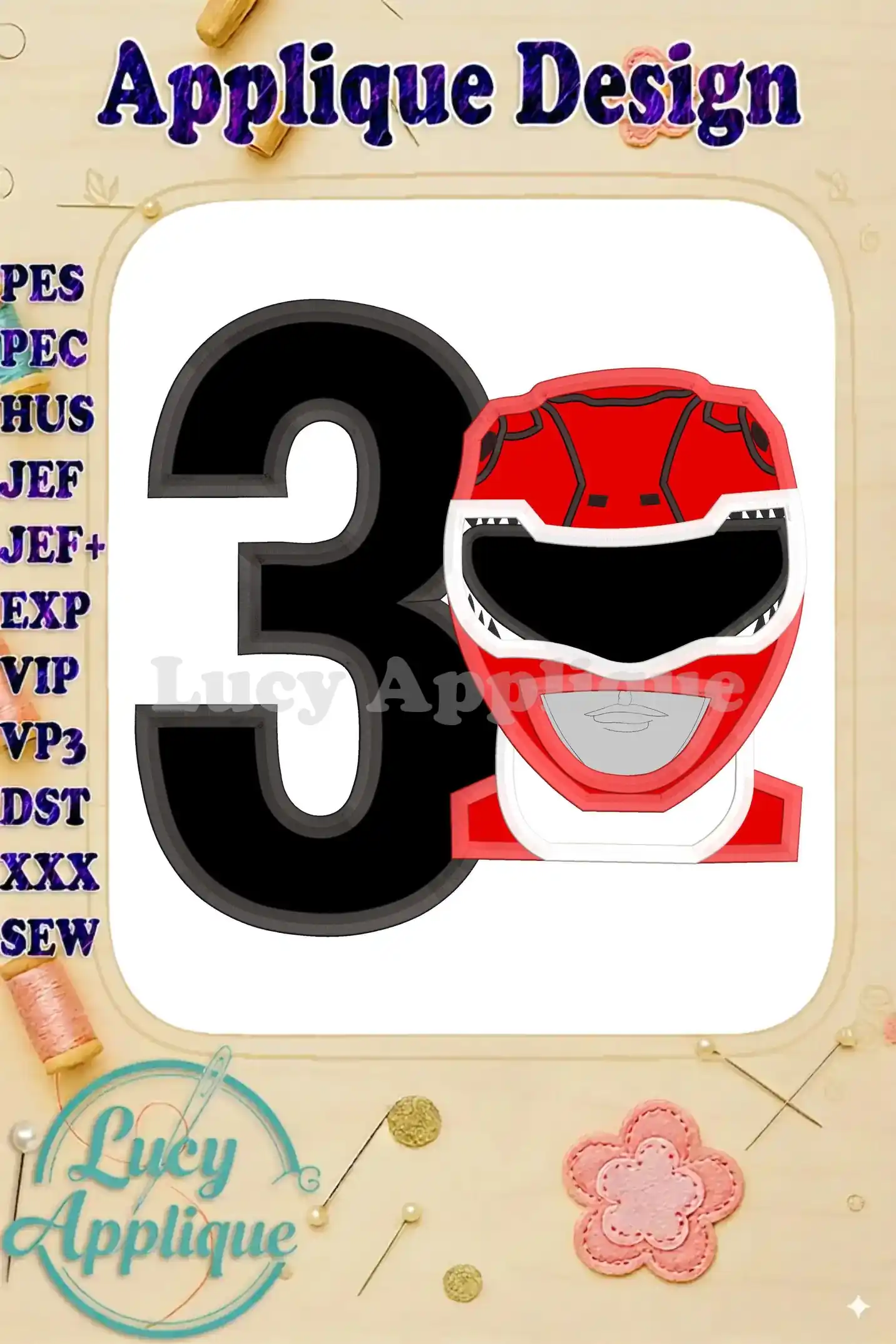 Red Power Rangers Head Birthday Number 3 Applique Embroidery Design – Instant Download