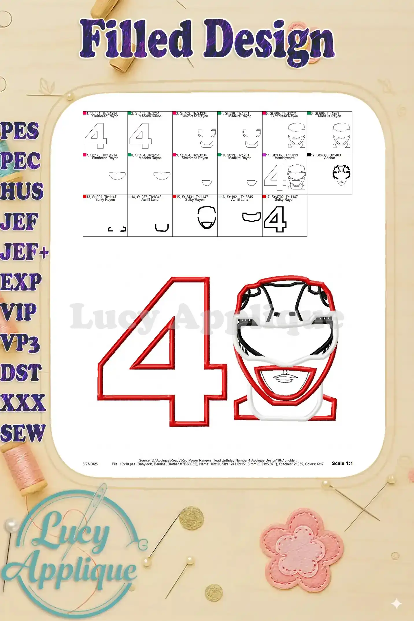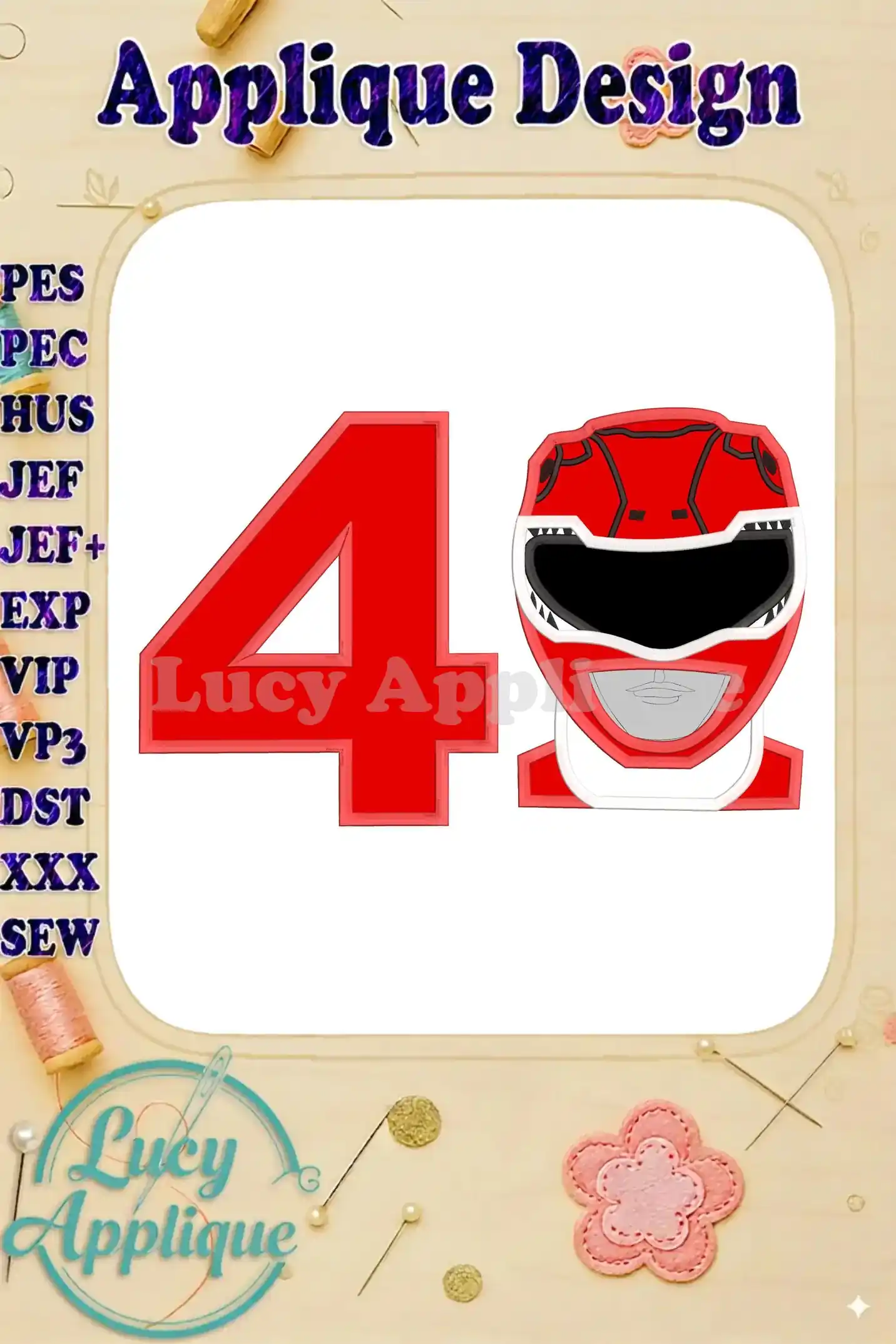 Celebrate your child’s 4th birthday with this vibrant Red Power Rangers applique design! Perfect for adding a superhero touch to their special day. Download includes multiple formats and color charts for easy embroidery.